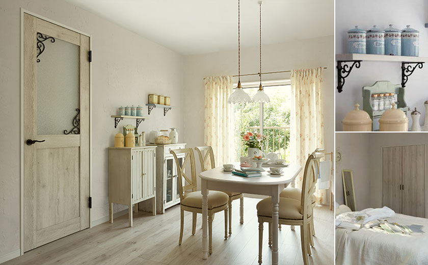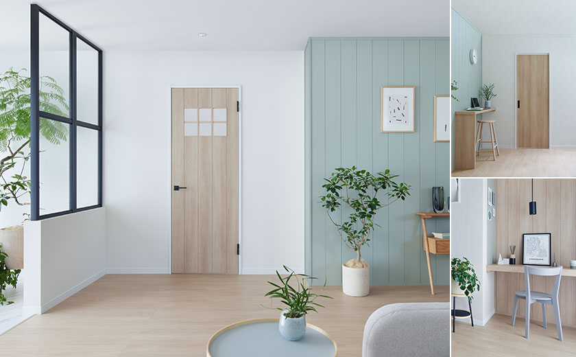 異なる色のドアを組合せても違和感なくコーディネートできるのがパレットの魅力。ナチュラルなインテリアで居心地のいい部屋づくりが可能です。