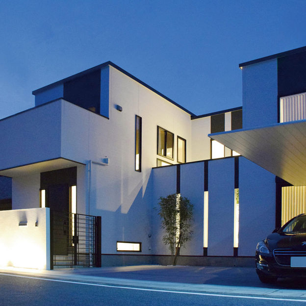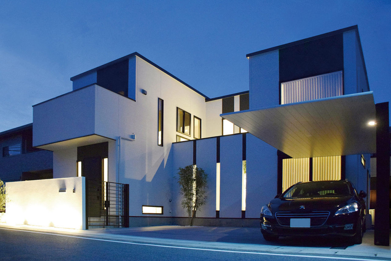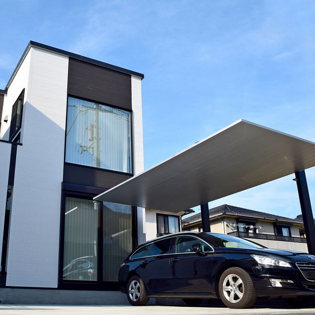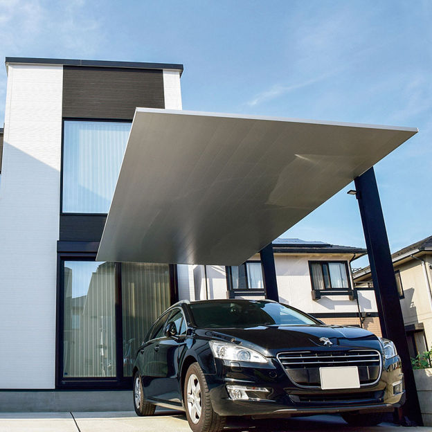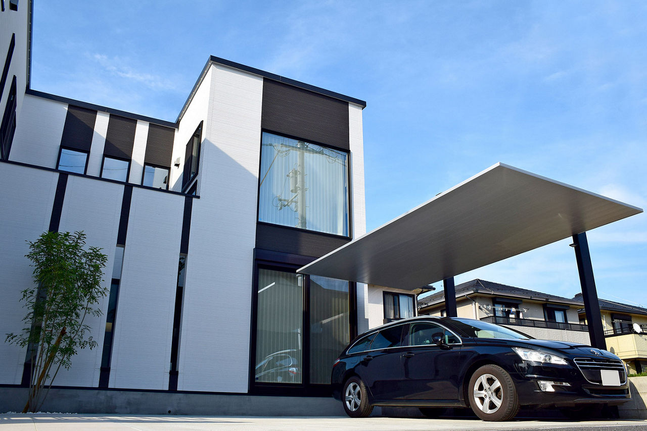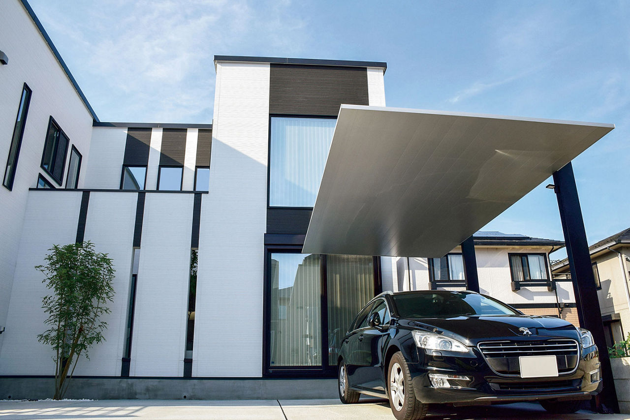 モダンなデザインの建物と調和させるため、カーポートSCを選択。建物のアクセントカラーに合わせてカーポートの柱も黒色にすることで、より一体感を生み出しました。植栽もあえて少ない本数でピンポイントに植えることで、洗練された雰囲気に。