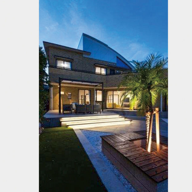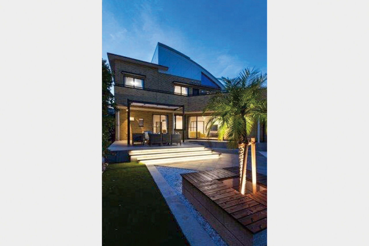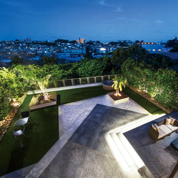 高台にある自宅からの夜景を、大きくせり出したタイルデッキから一望できます。ベンチを植栽回りに設け、たくさんの友人を招いた際、気軽に腰かけてもらえるように。一日の終わりに美味しいお酒を飲んで幸せな気持ちになれるラグジュアリーな空間です。
