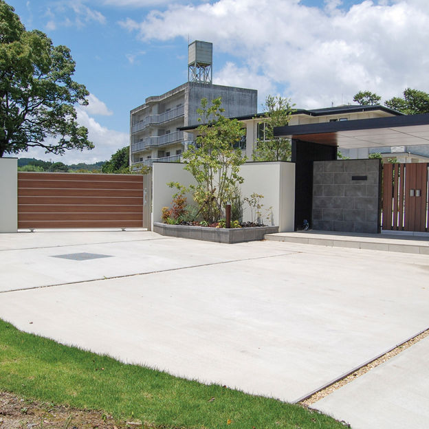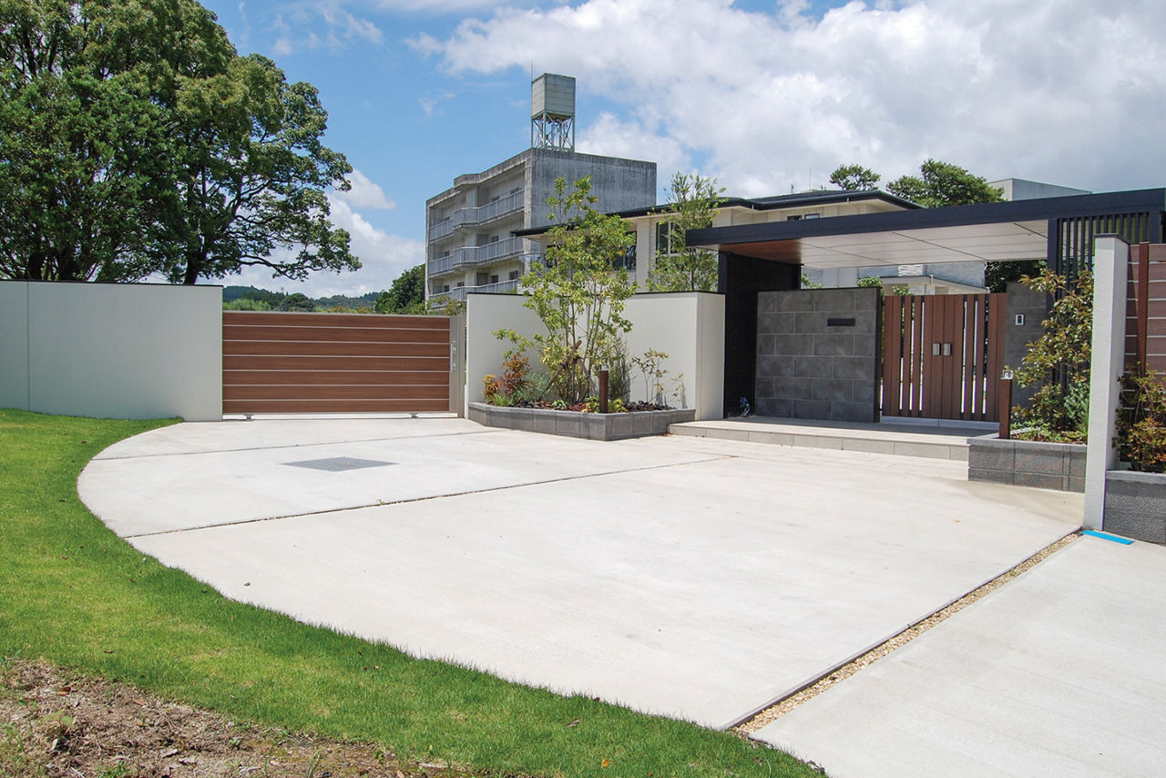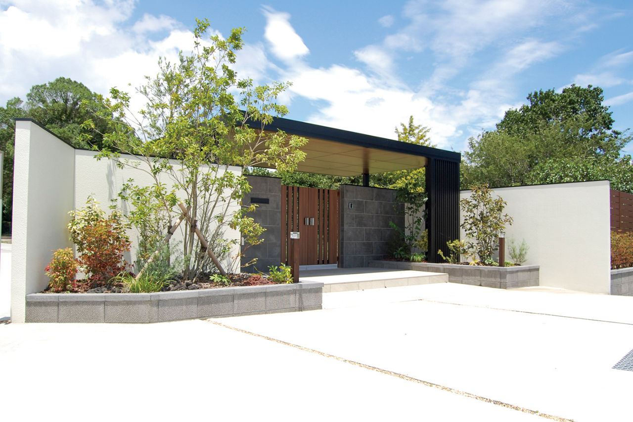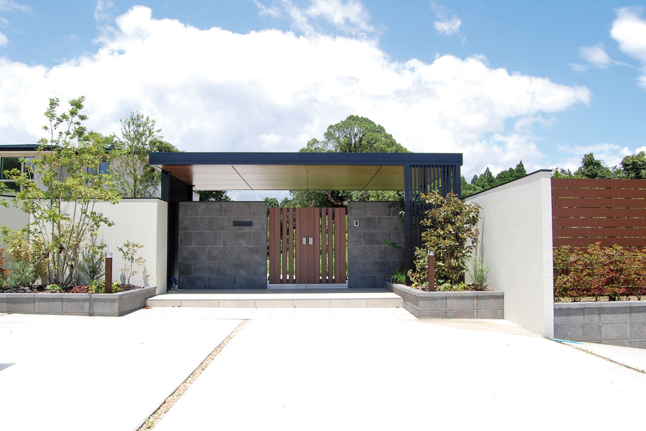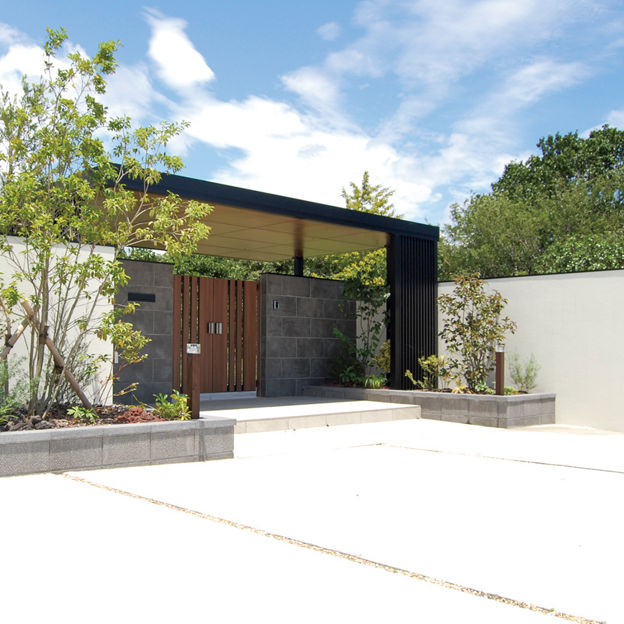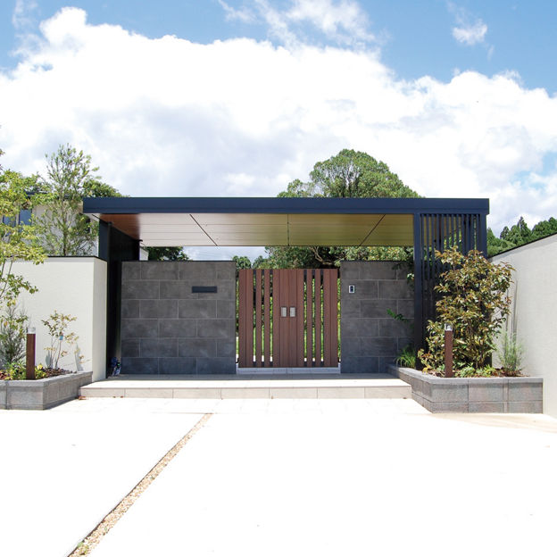 プラスGのカールーフを、門まわりの屋根として使用。厚みのある屋根が、門まわりを強調してくれます。柱とフレームはブラック色で重厚感を出しつつ、暗くなりすぎないようその他の部分に木目調カラーを取り入れています。