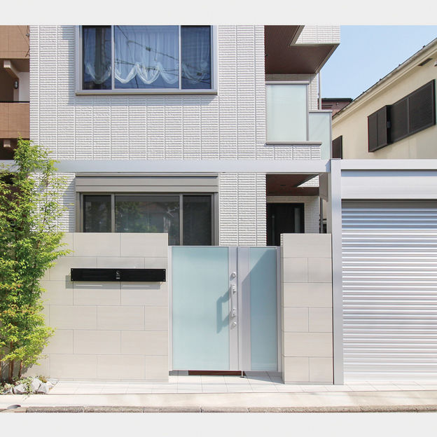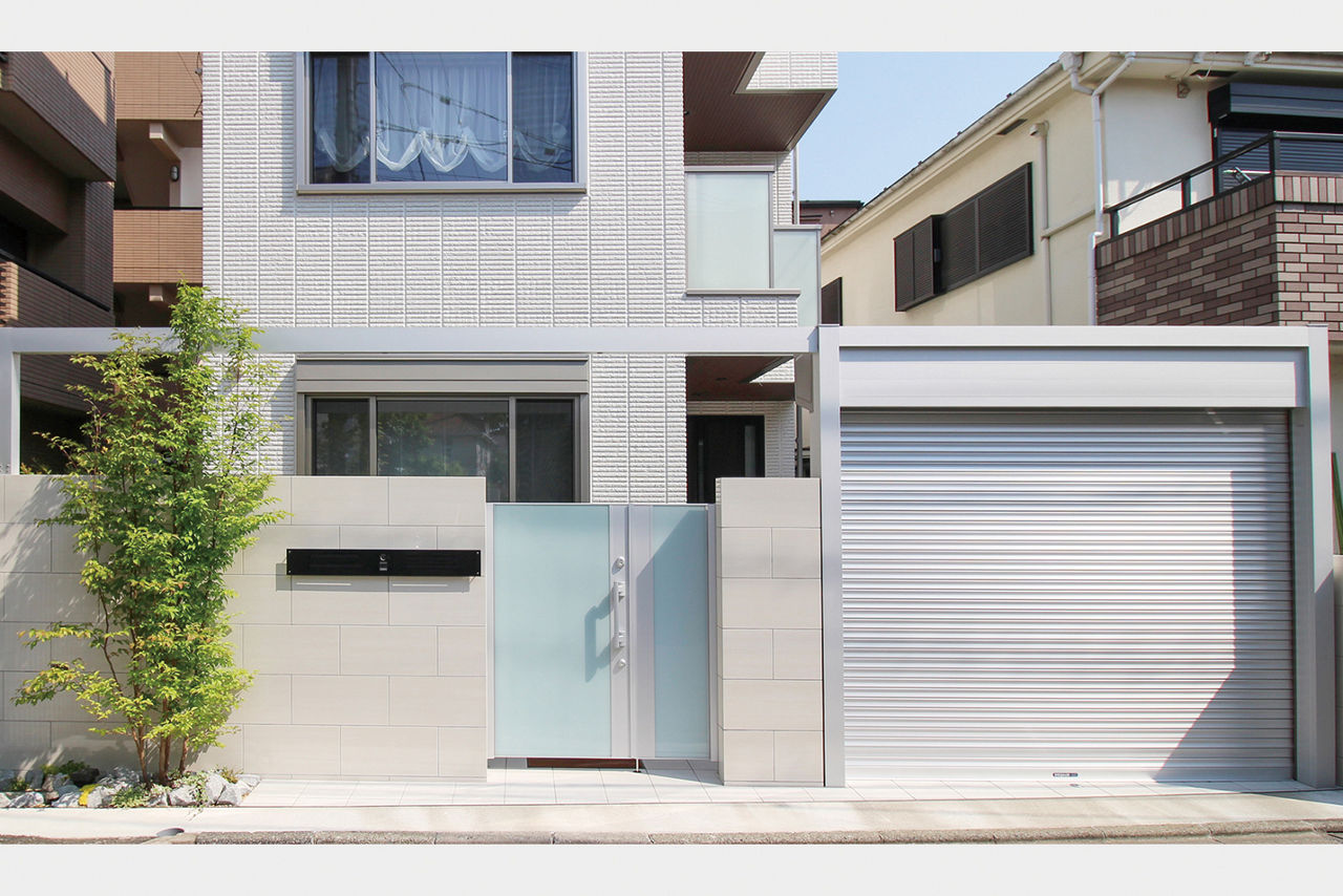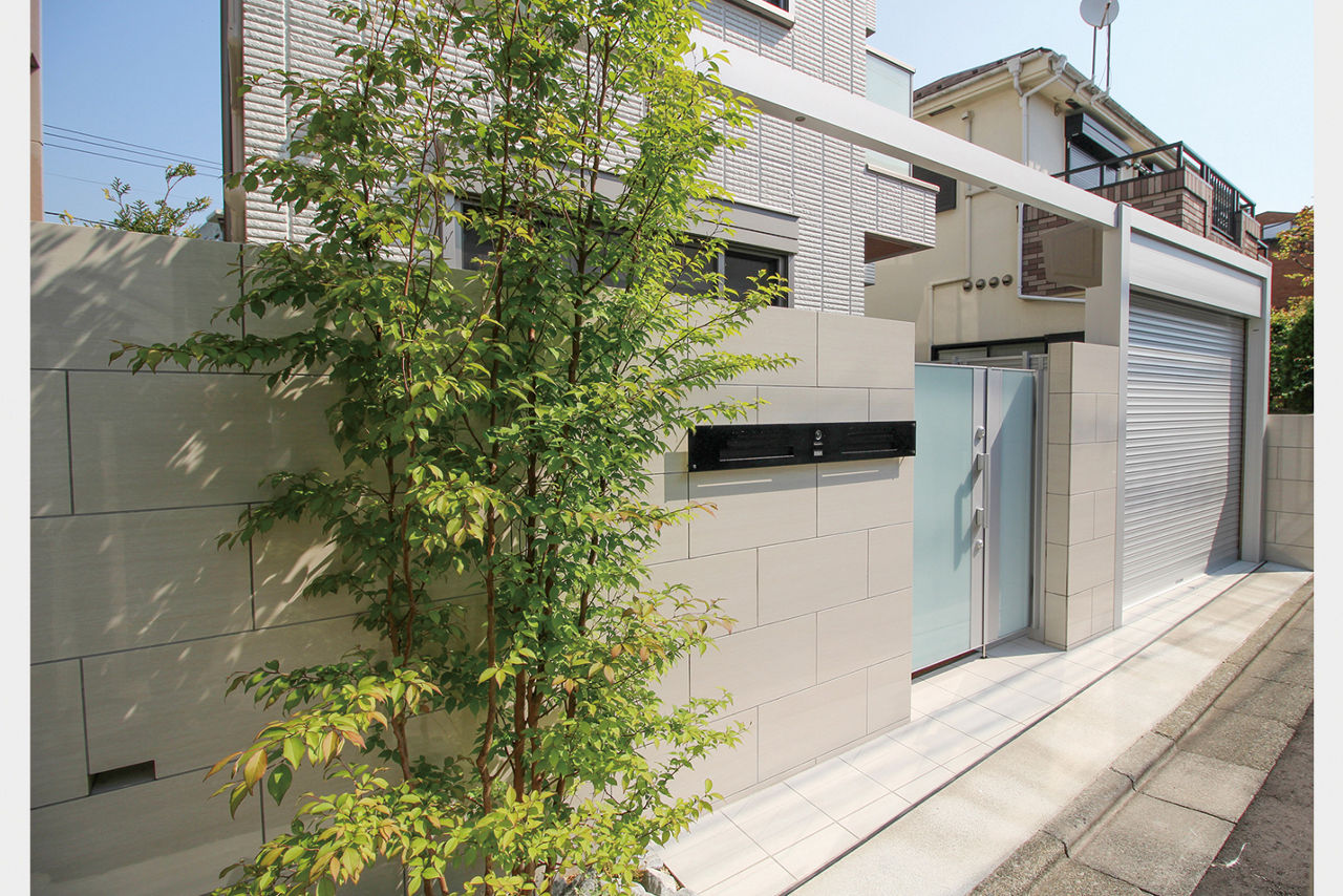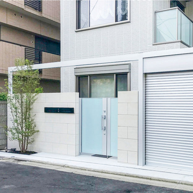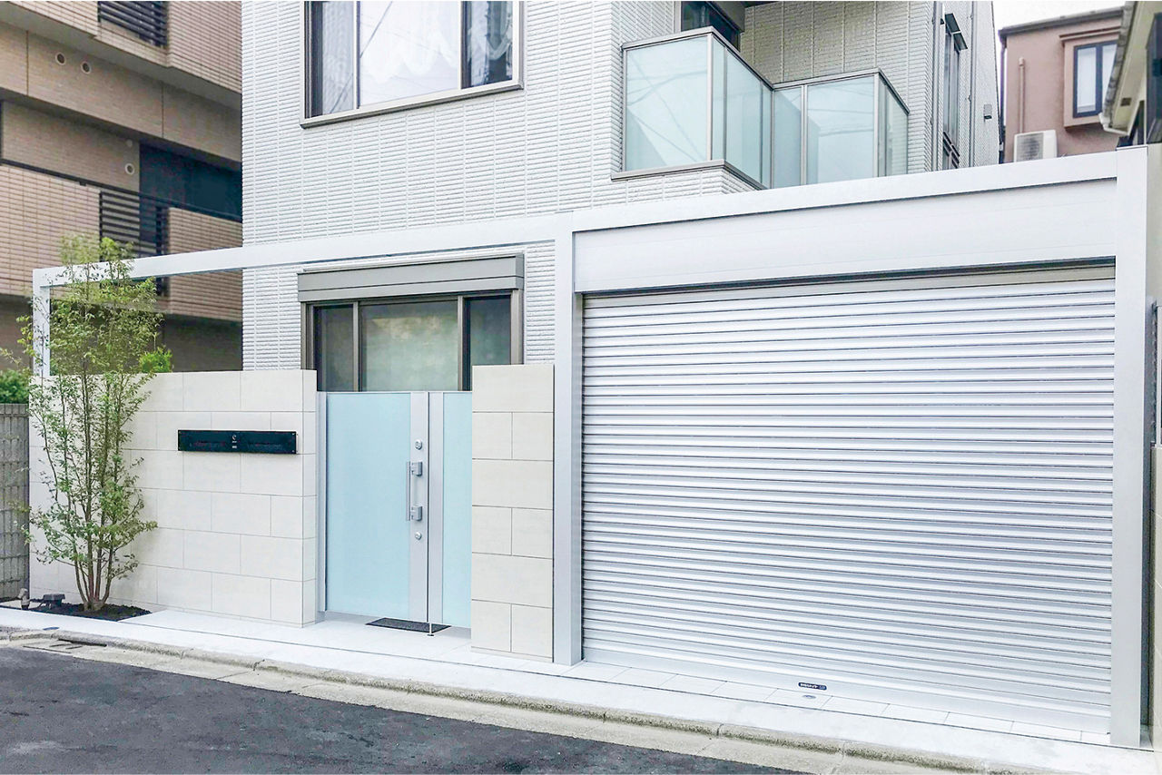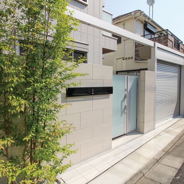 白い住宅外観に合わせたクローズ外構のデザイン。ガラス表面が美しい門扉を中心に、壁には磨き仕上げの大判タイルを使用し、シャッターはシルバー色を合わせています。シャッターとフレームを接続してアーチゲートとすることで、空間に一体感が生まれます。狭小地でも奥行感のあるファサードエクステリアです。