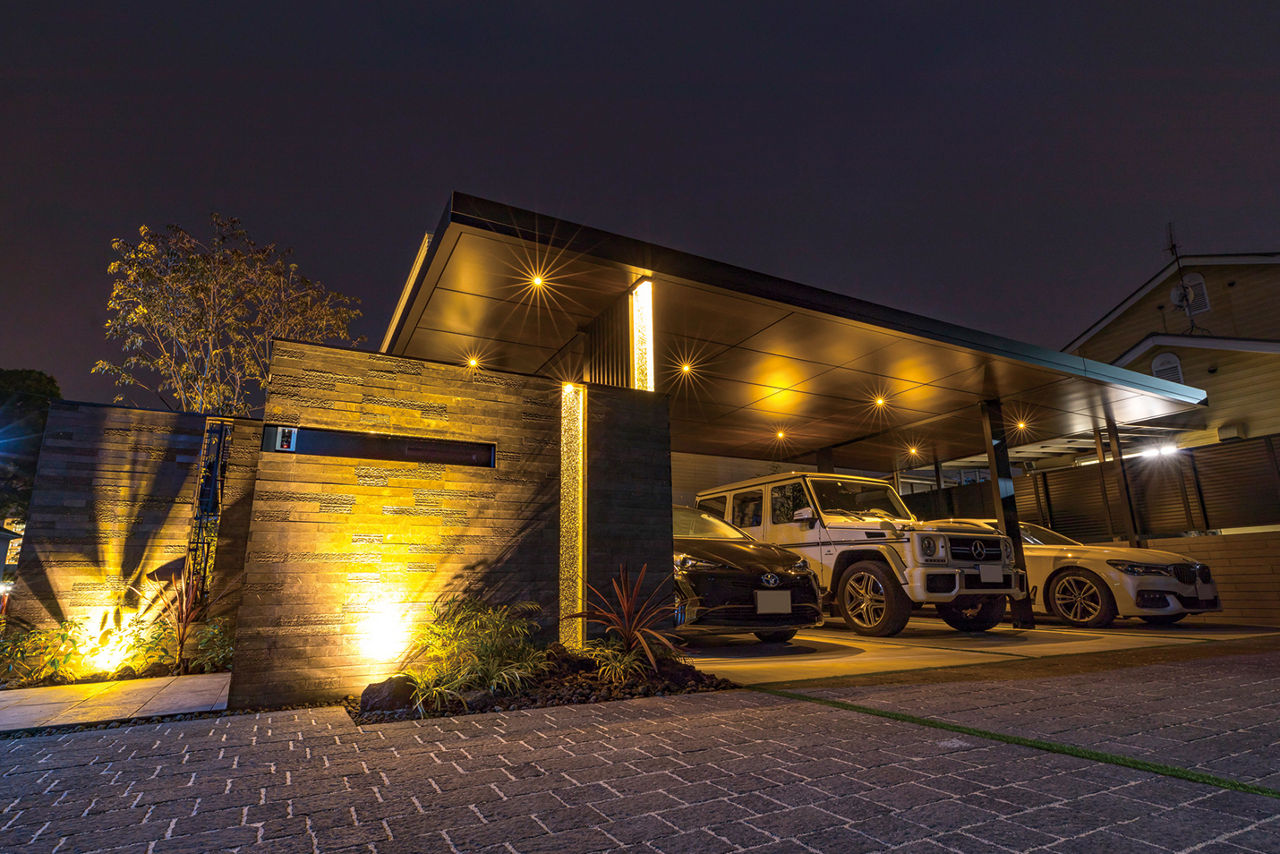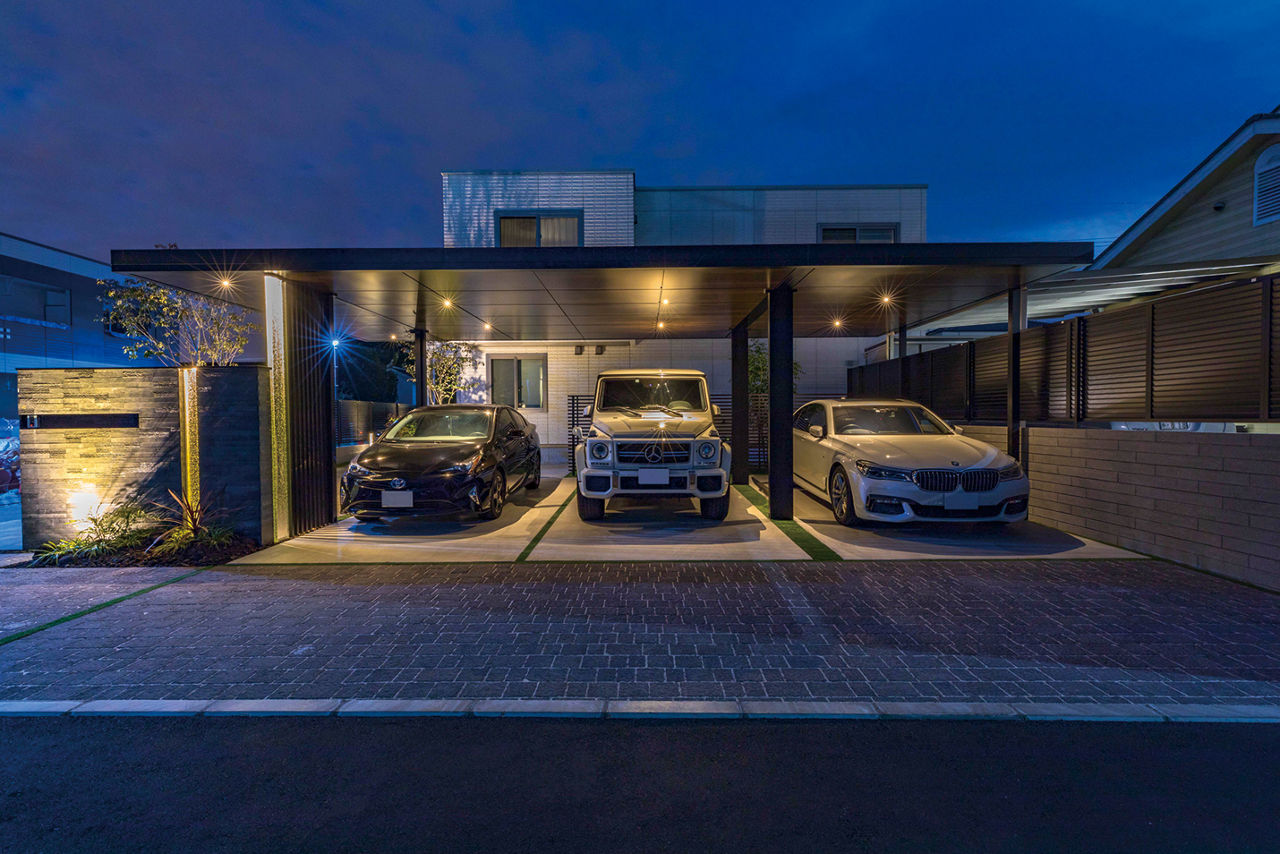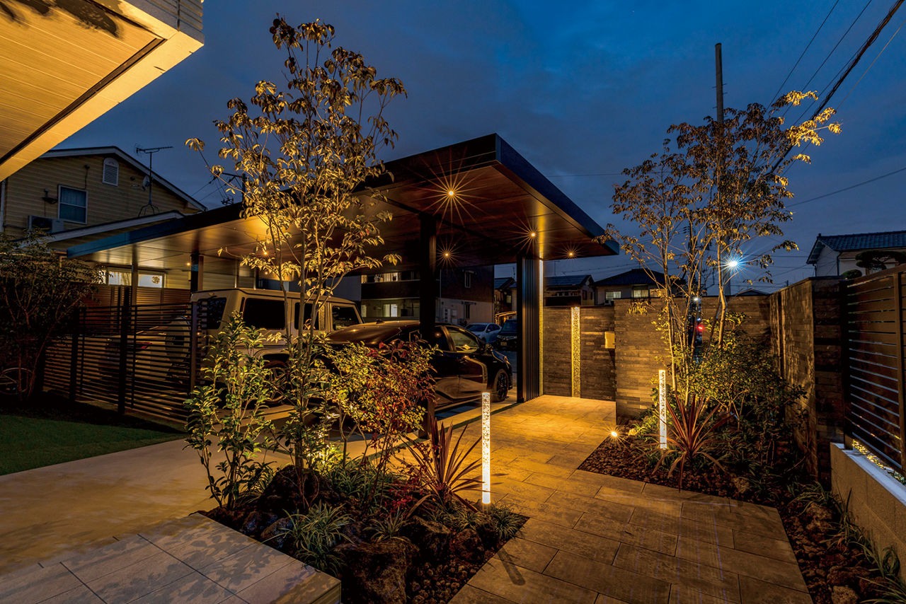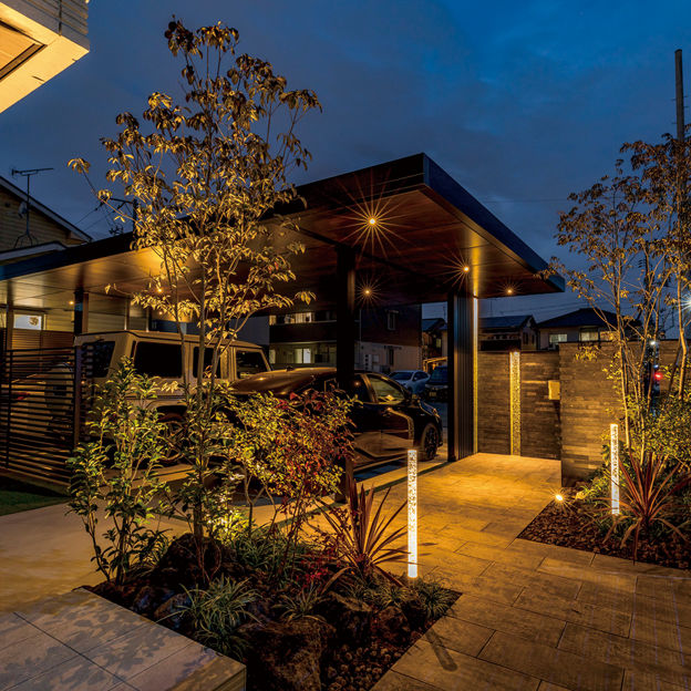 連棟されたカーポートの水平・垂直のラインが建物にも調和しています。角地を有効利用し、外部からの視線はカットしながらもオープンな外構に。植栽と照明にもこだわり、夜間も安全でかっこいい外構デザインが表現されています。