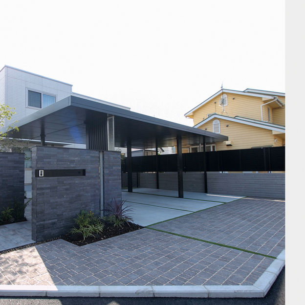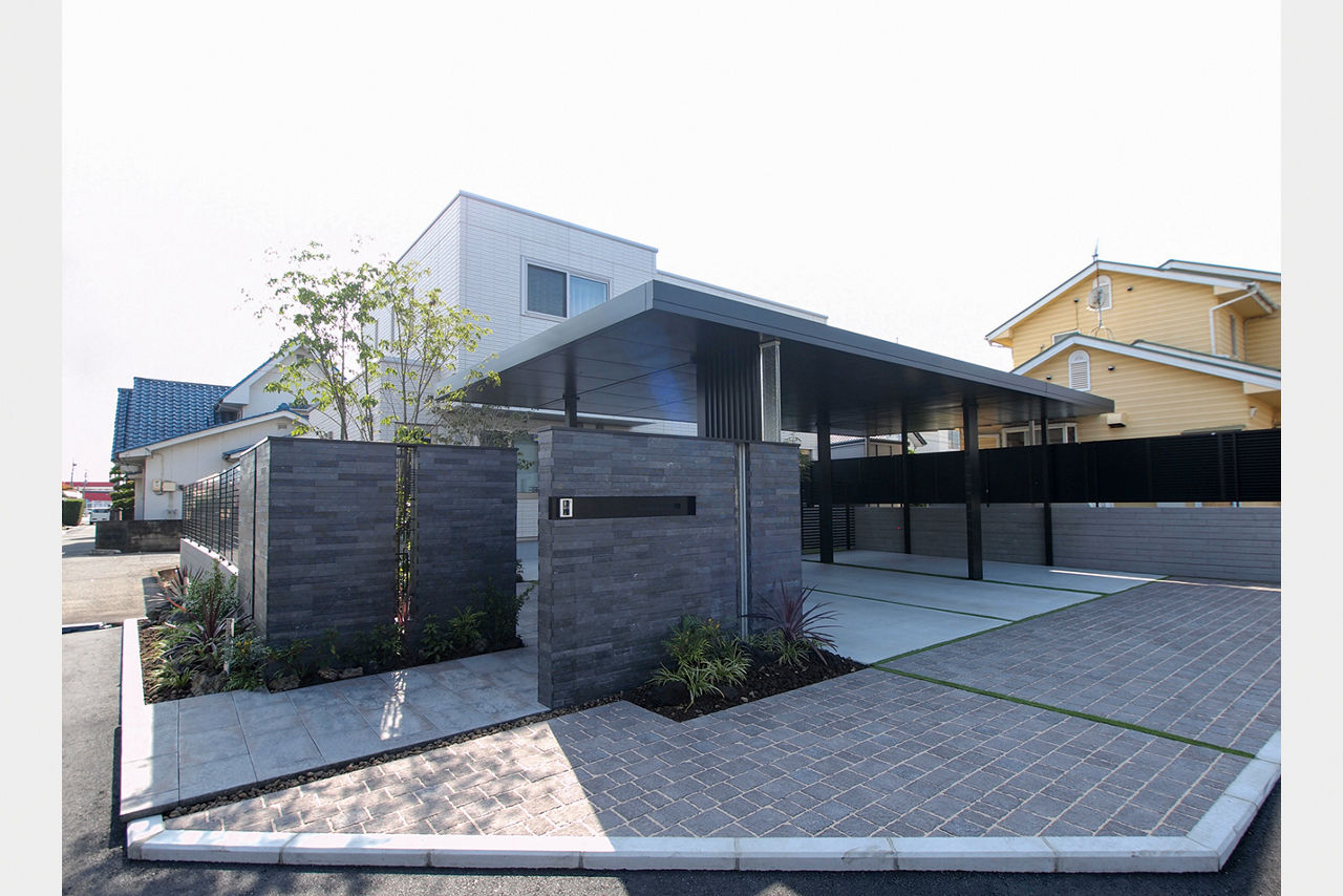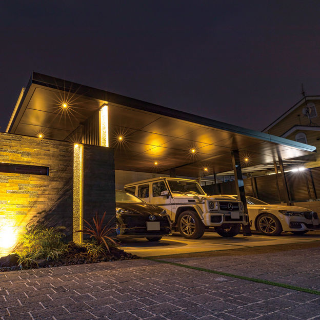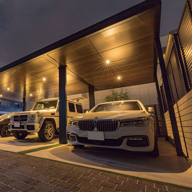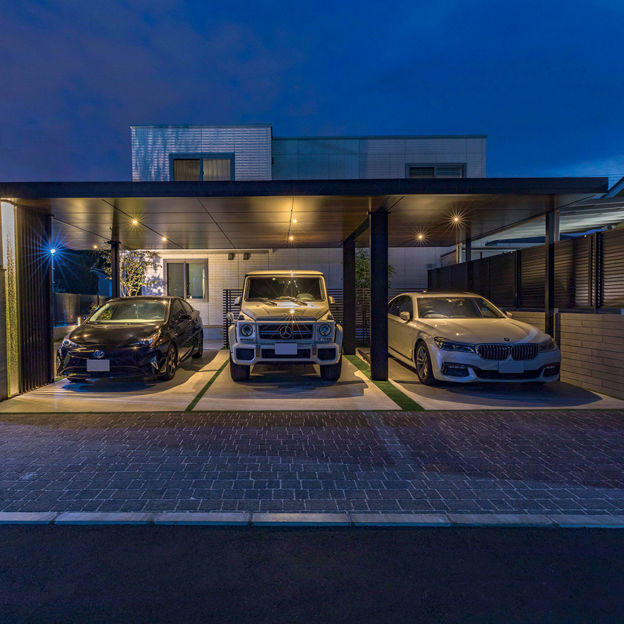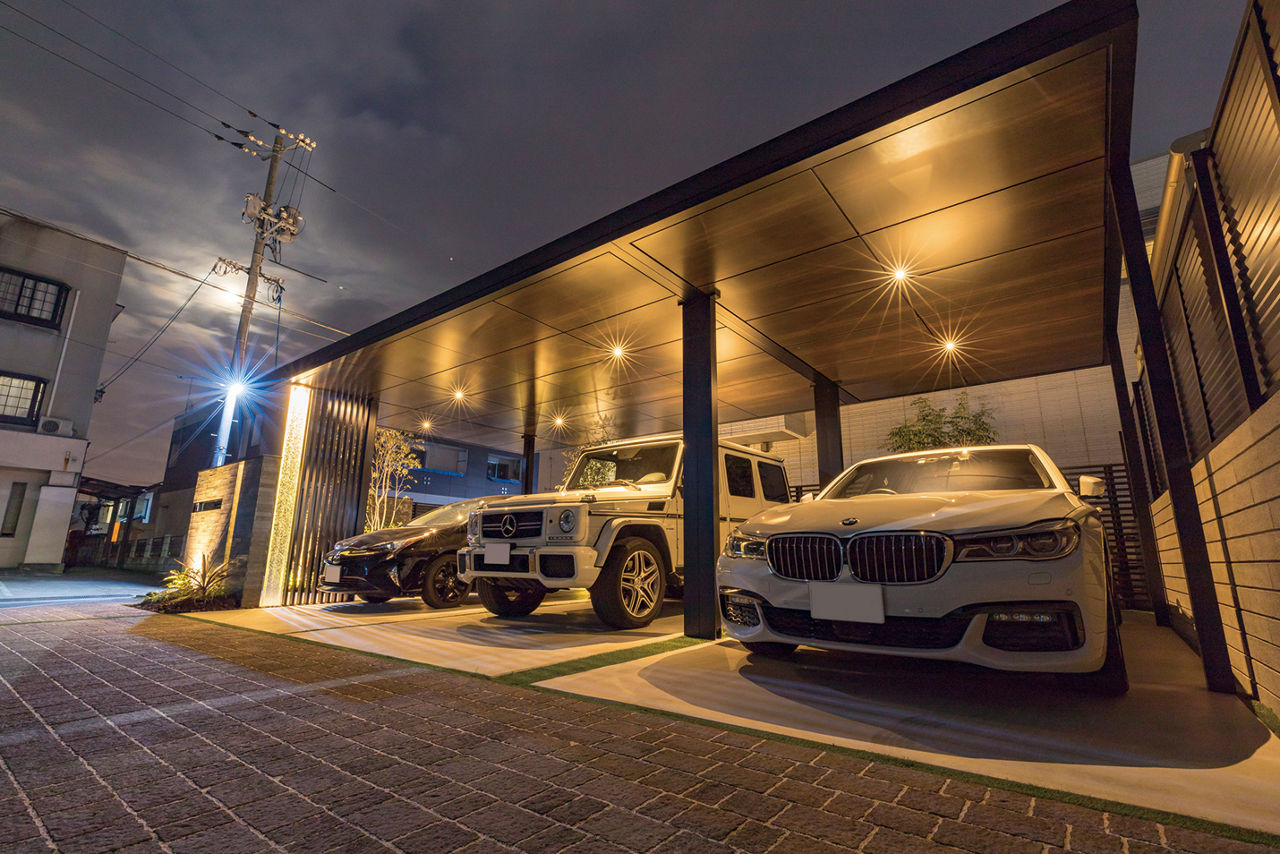 連棟されたカーポートの水平・垂直のラインが建物にも調和しています。角地を有効利用し、外部からの視線はカットしながらもオープンな外構に。植栽と照明にもこだわり、夜間も安全でかっこいい外構デザインが表現されています。