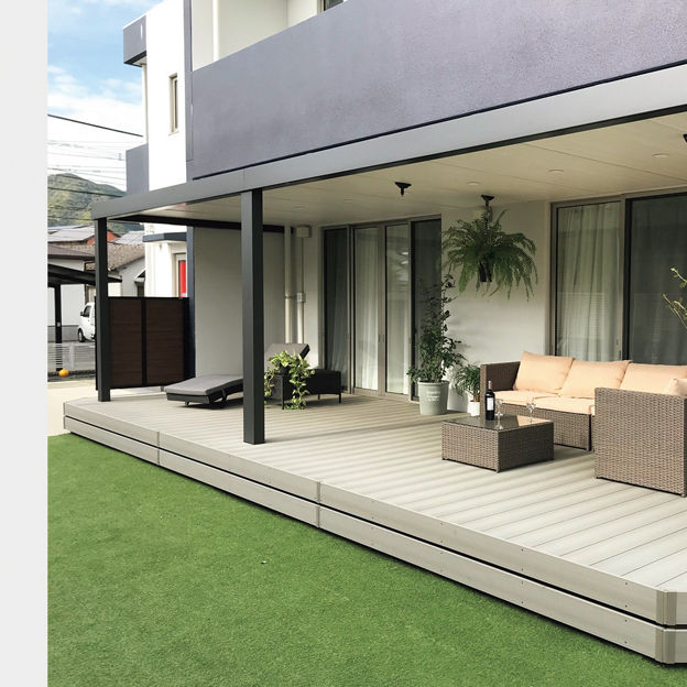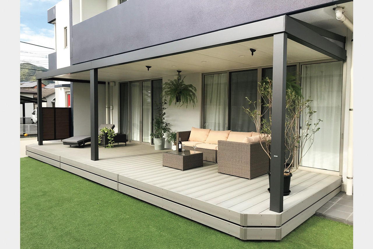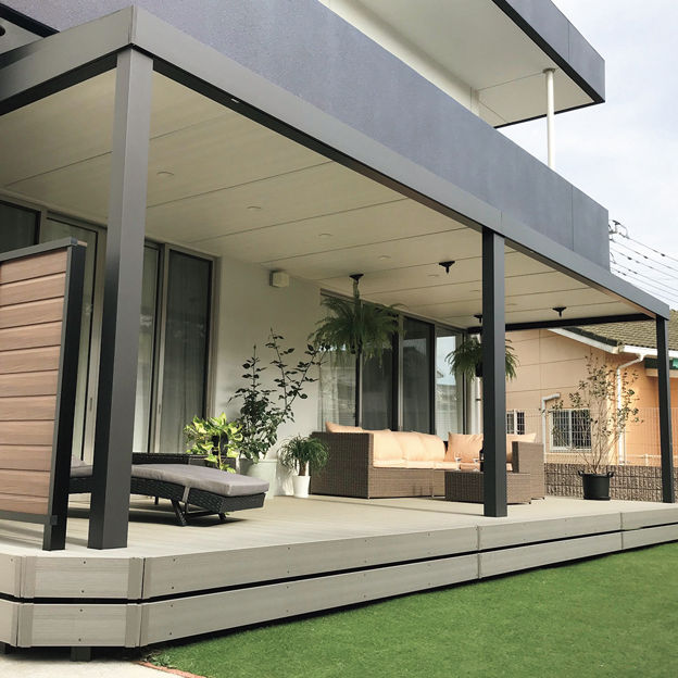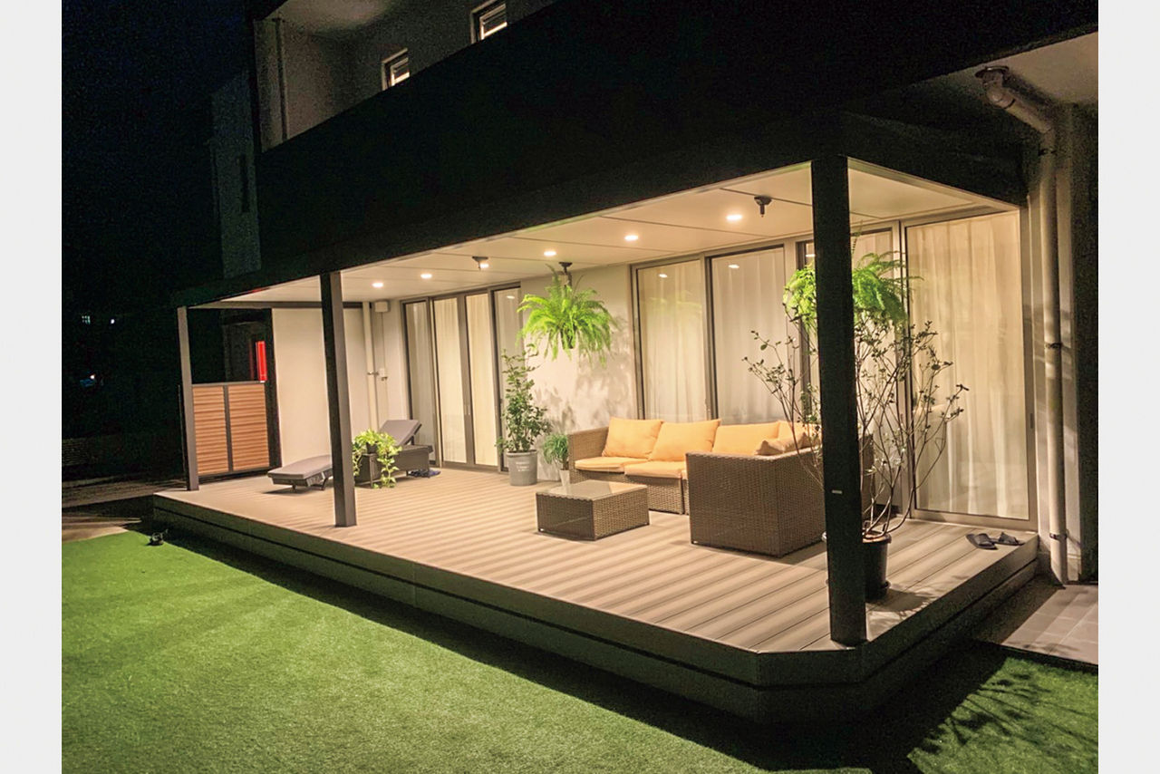ウッドデッキとテラス屋根の色調を建物の外観に合わせることで、スタイリッシュな雰囲気を壊さず、後付でも一体感のあるデザインに。家にいながらリゾートの雰囲気を楽しめます。とくに、夜間はダウンライトの灯りで癒しの空間に。