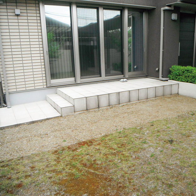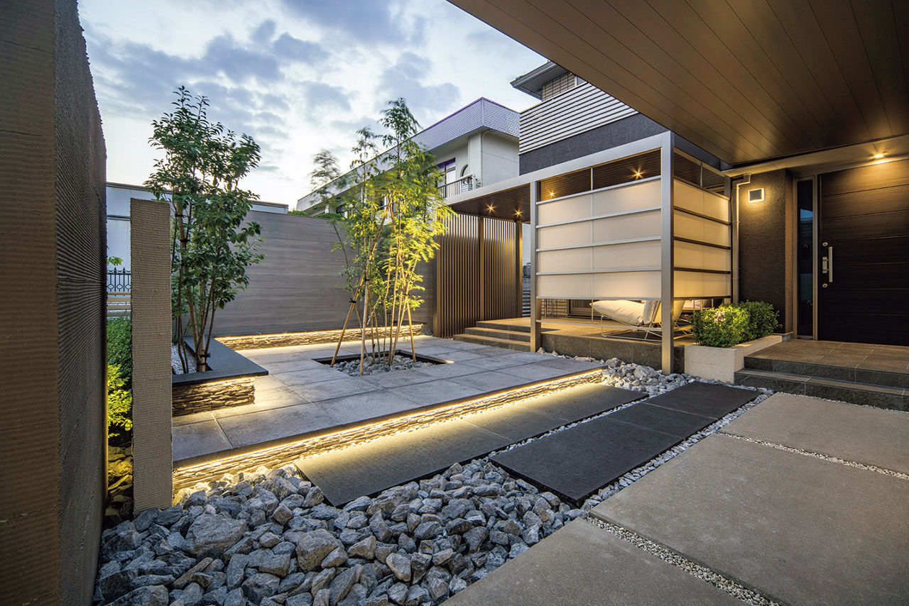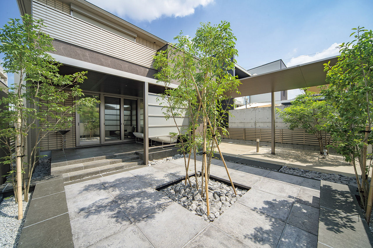 掃出し窓の前にG ルーフ、G スクリーンを設置し、ほどよく目隠しすることで、 快適に過ごせるテラス空間に。中央のシンボルツリーやライン照明により、室内やアプローチからの景色も楽しめます。