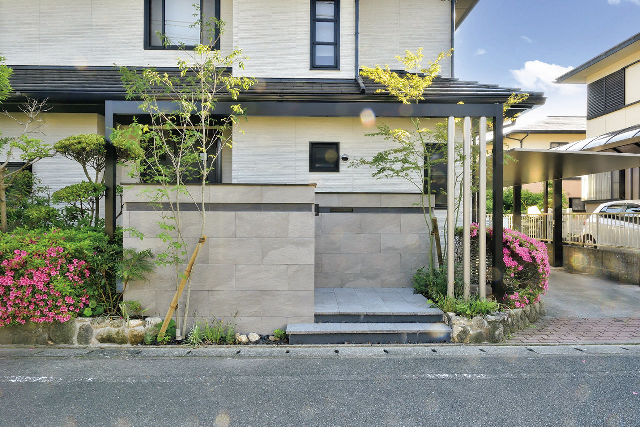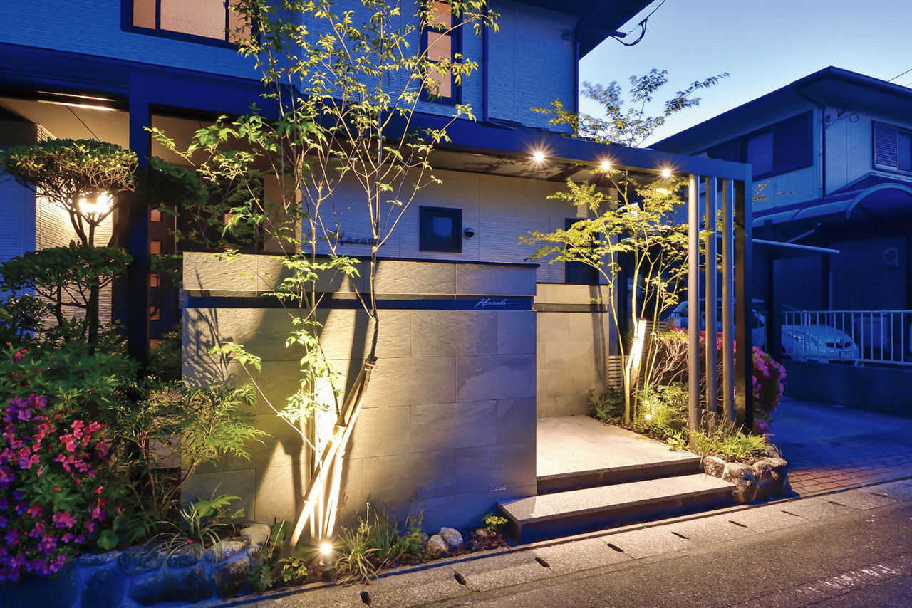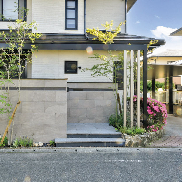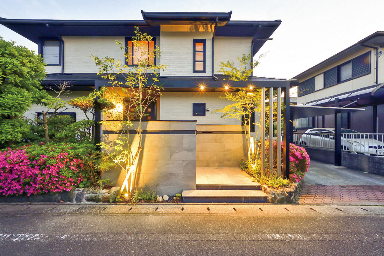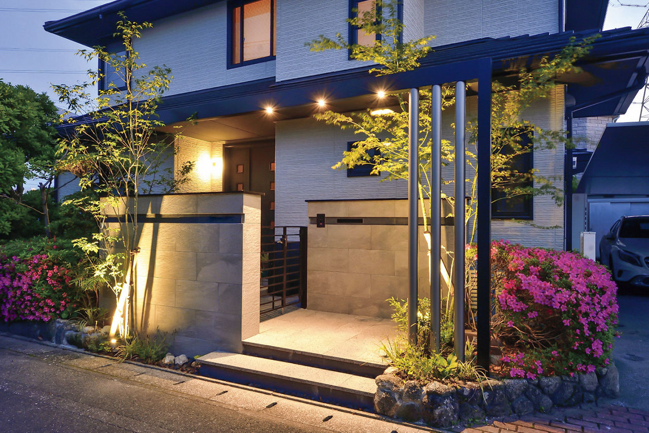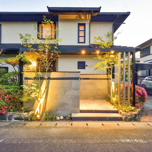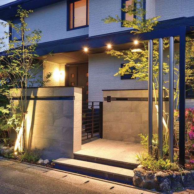 正面のGフレームを、カーポートと建物のサッシの色に合わせてブラックとシャイングレーにすることで、一体感のある外構に。Gフレームにダウンライト、植栽の足もとにスポットライトを取り入れることで、夜間はあたたかい表情を楽しめます。