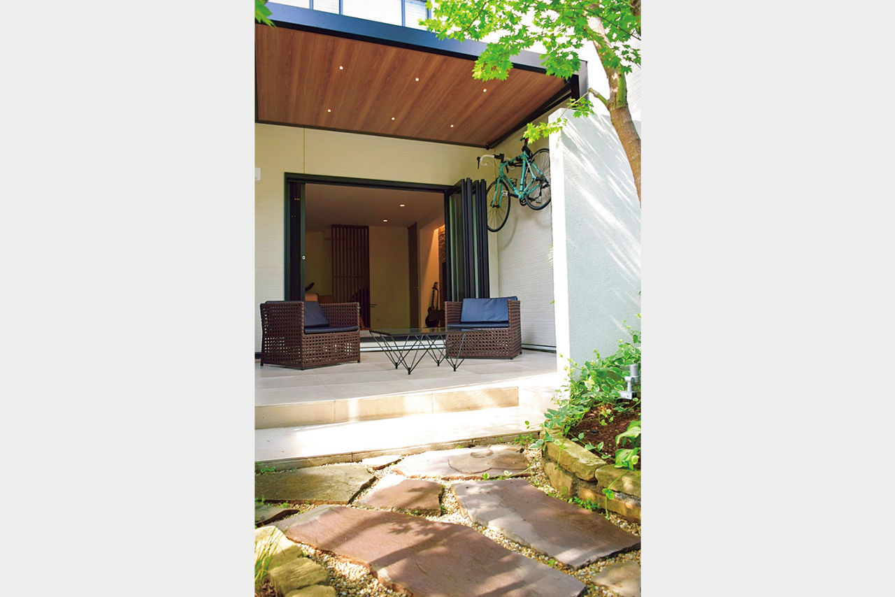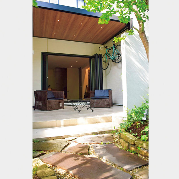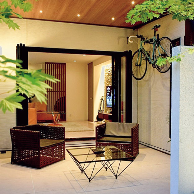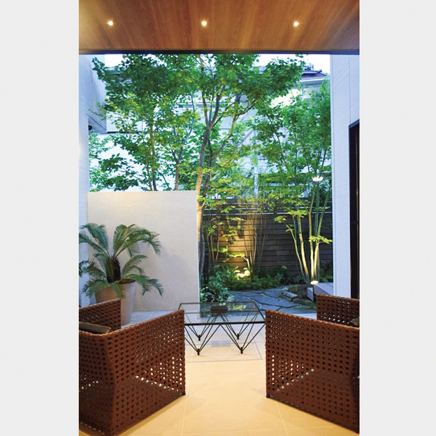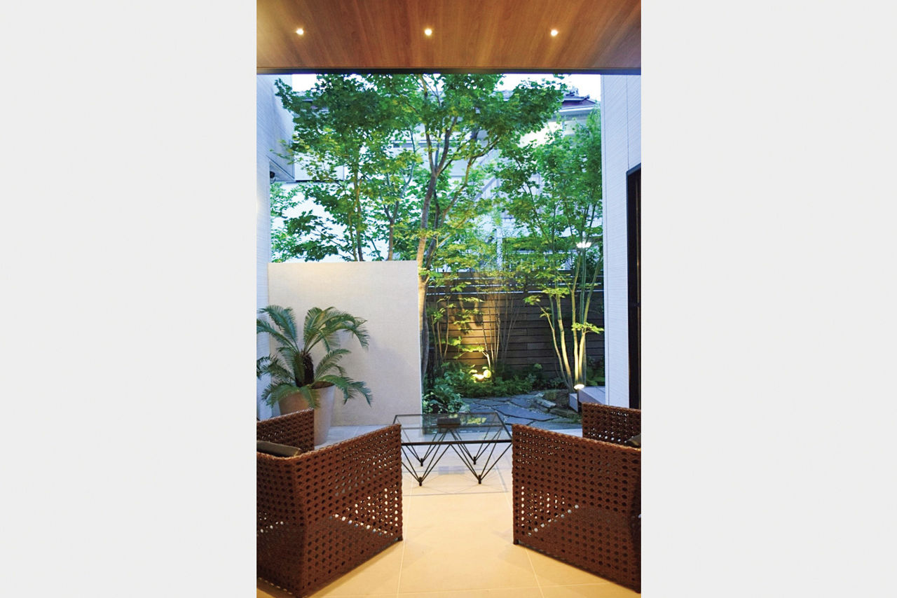 落葉樹を中心に植栽することで、春の新緑、夏の木陰、秋の紅葉、冬は日あたりの良い庭になり、四季折々を楽しめます。また、テラス屋根を設置することで雨や日差しを気にせずお庭を楽しめ、夜はライトアップにより特別な空間に変化します。