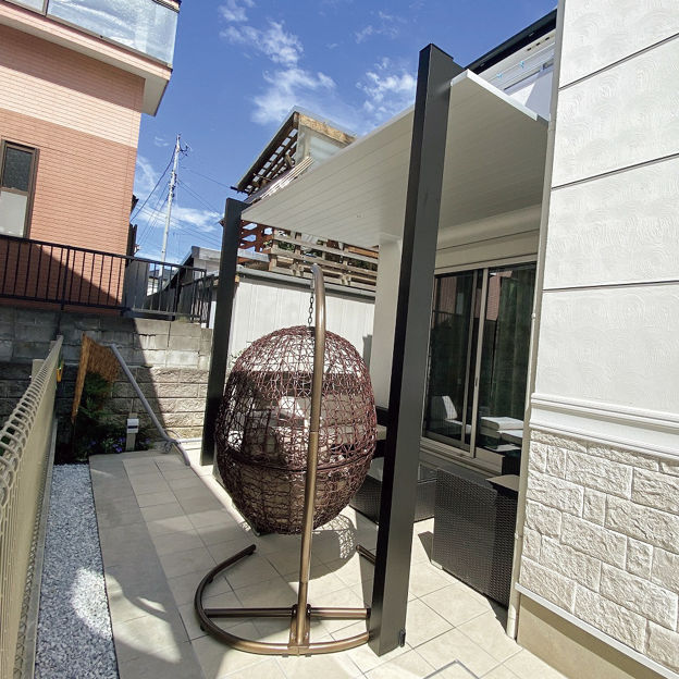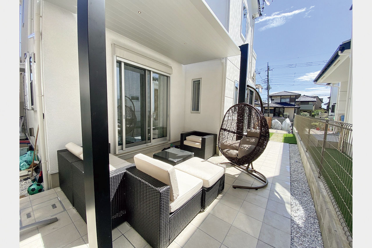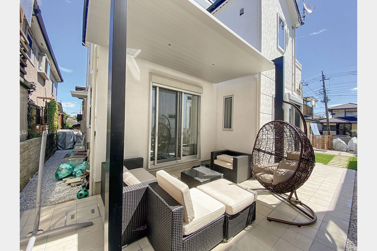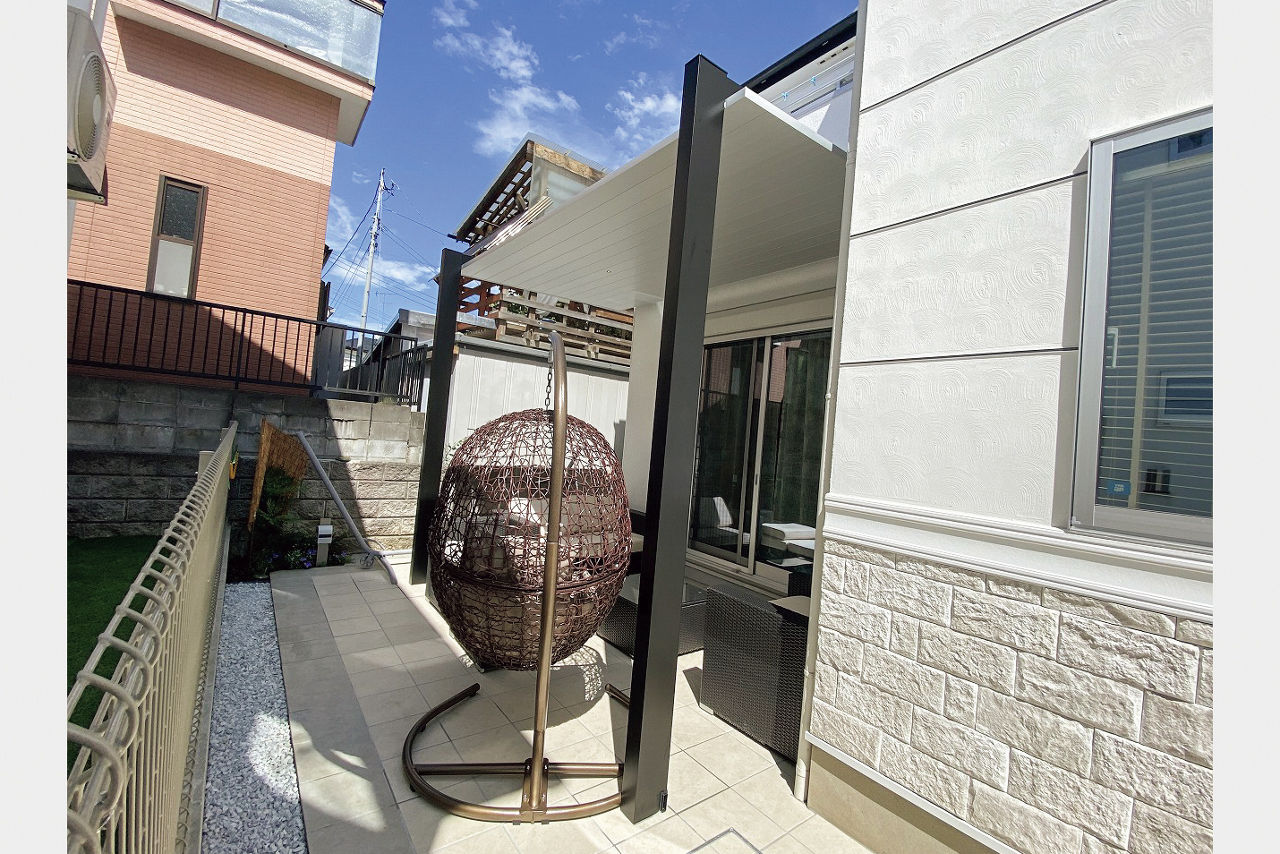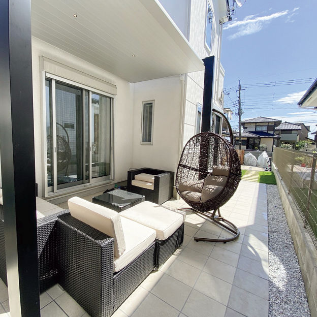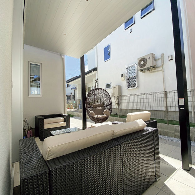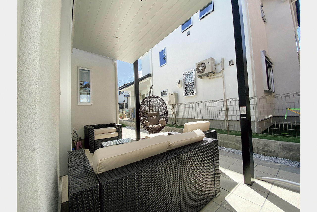 白を基調とした建物になじむ、モノトーンのツートンカラーのテラスSCを設置。屋根にダウンライトを埋め込み、昼間だけではなく、夜も楽しめる空間に。