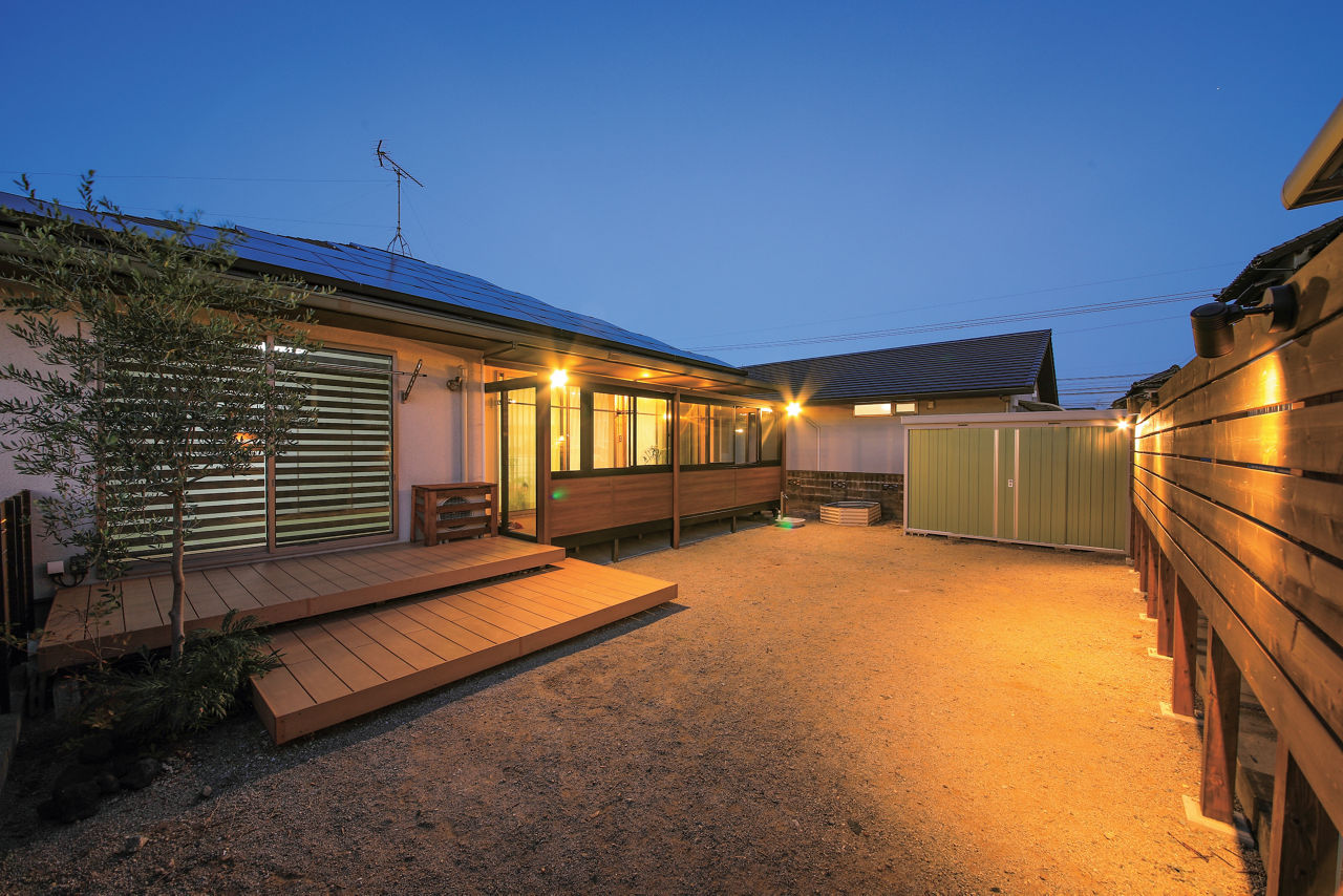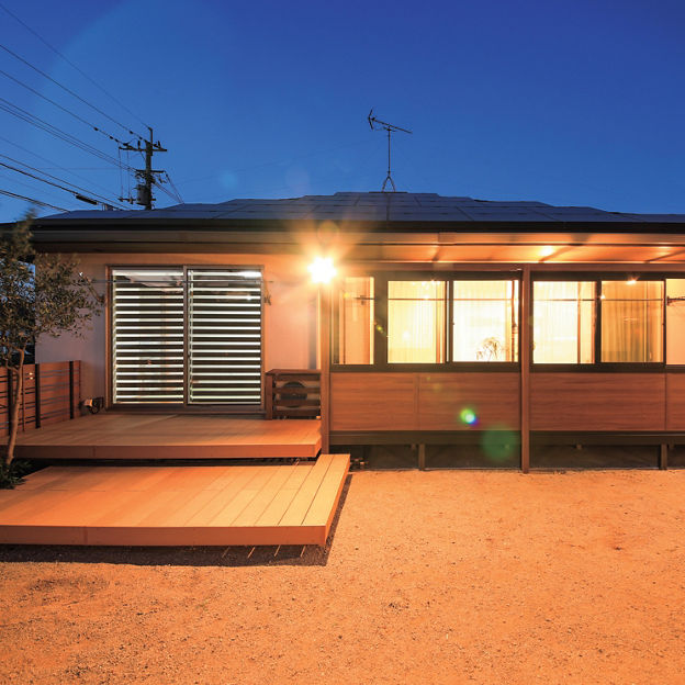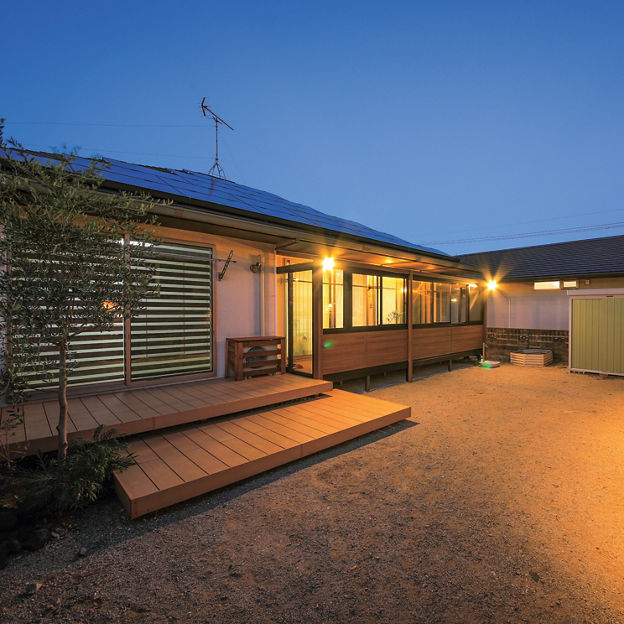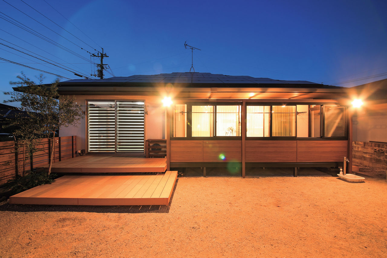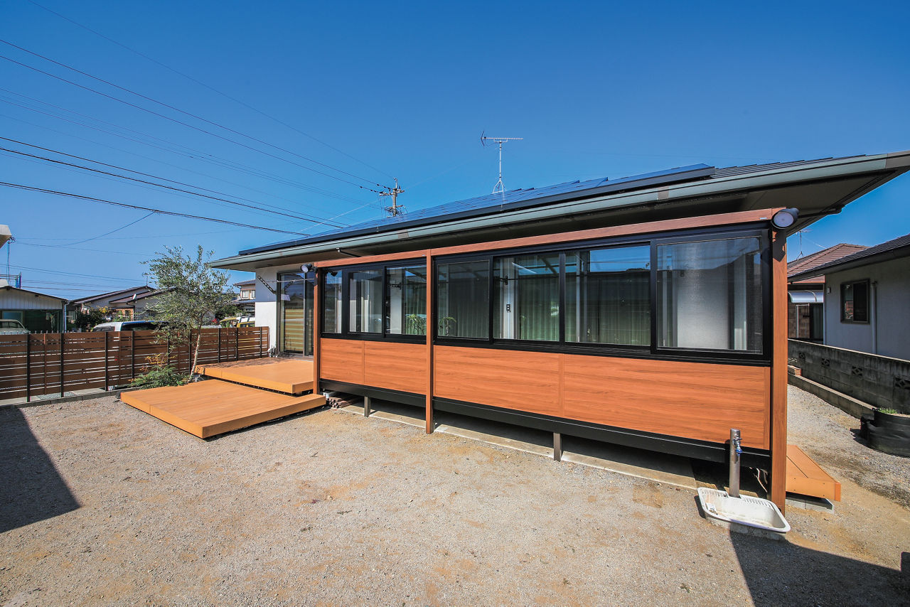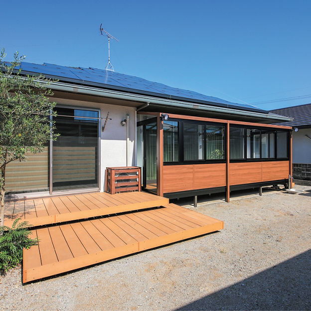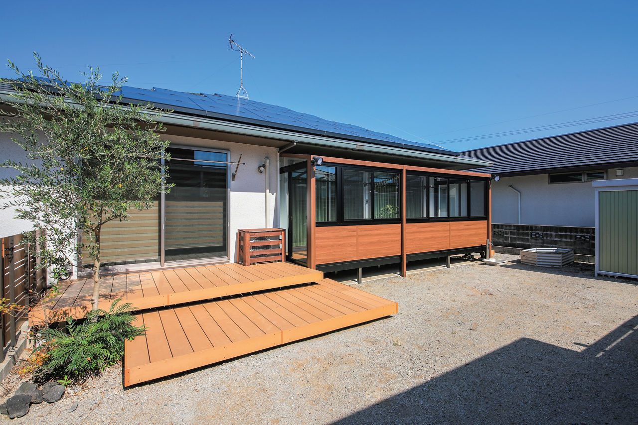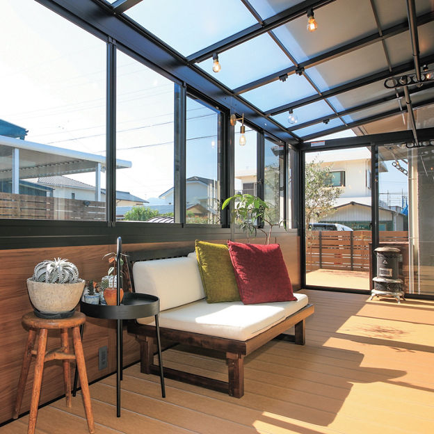 ガーデンルームGFと既存のデッキスペースを連結し、一体感のあるくつろぎ空間に。ガーデンルームを設置することで室内から庭への動線も良くなり、使い勝手も向上。足元や見せたくない部分を隠せる腰壁仕様を取り入れ、居心地も高めています。