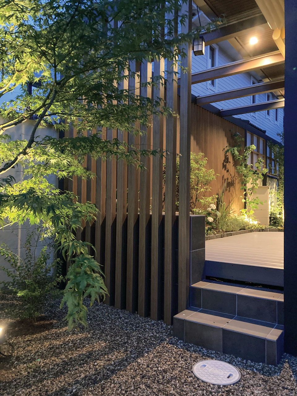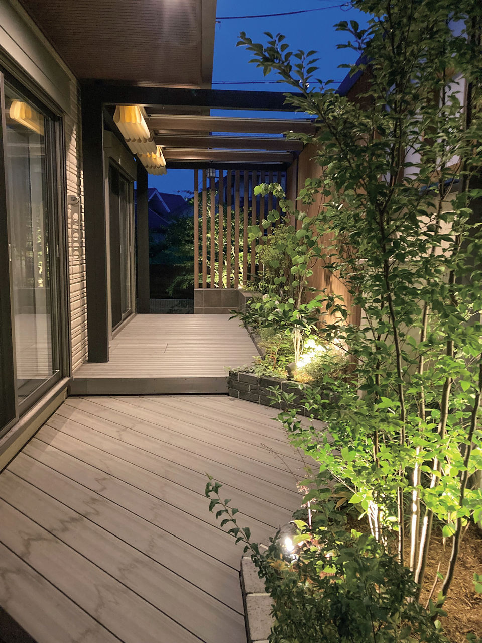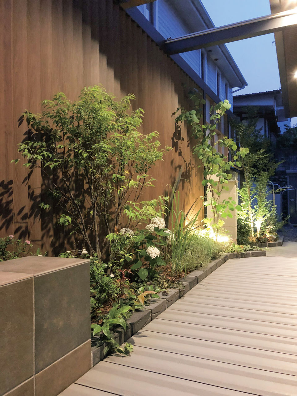 プライバシーを確保したい部分、採光や風通しを重視したい部分で格子の角度や間隔を変えるなどして仕様を分けたデッキスペース。細長い空間にデッキや花壇で段差を設けることで、奥行き感のある空間に。スクリーンのスリットから漏れる光が草花で彩られ、空間を華やかに演出しています。