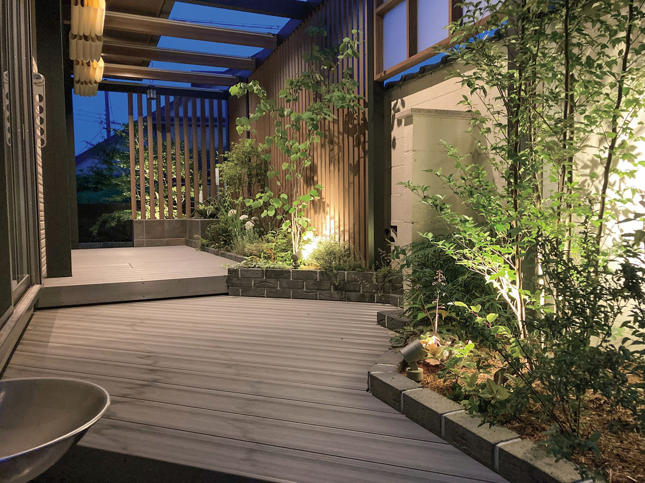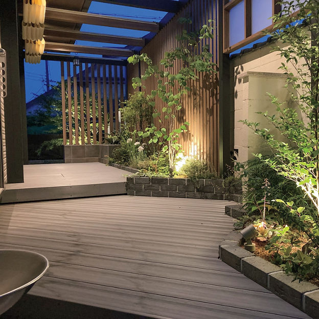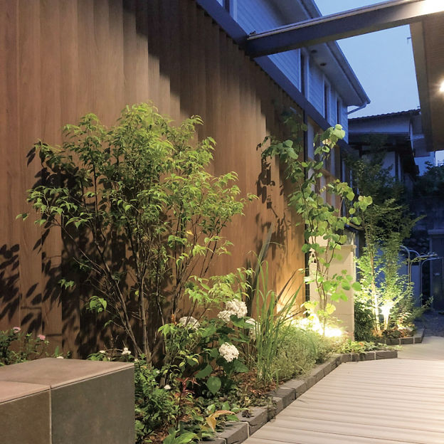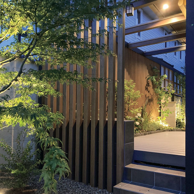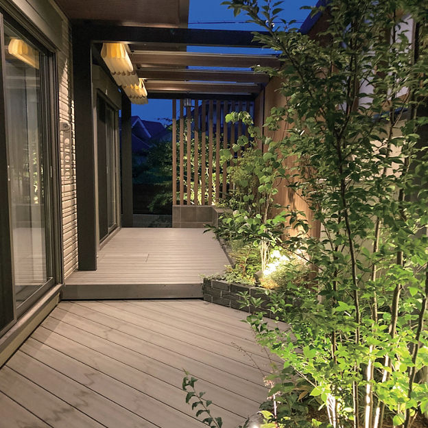 プライバシーを確保したい部分、採光や風通しを重視したい部分で格子の角度や間隔を変えるなどして仕様を分けたデッキスペース。細長い空間にデッキや花壇で段差を設けることで、奥行き感のある空間に。スクリーンのスリットから漏れる光が草花で彩られ、空間を華やかに演出しています。