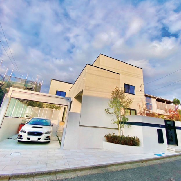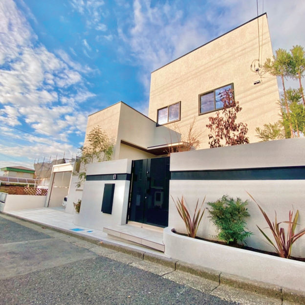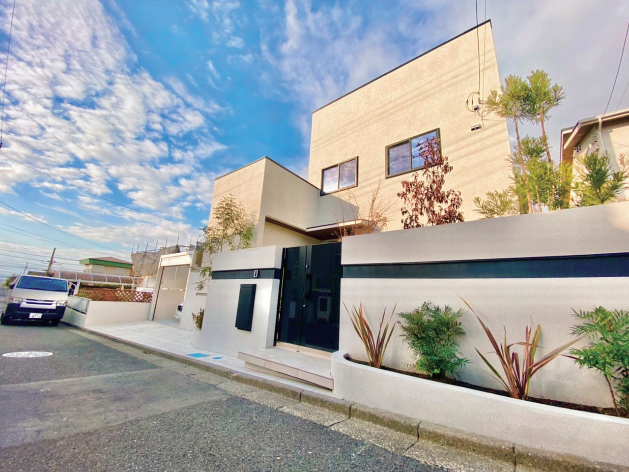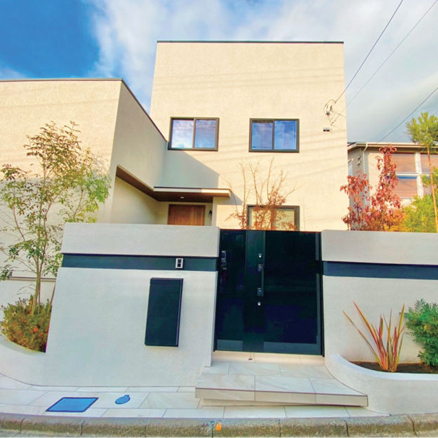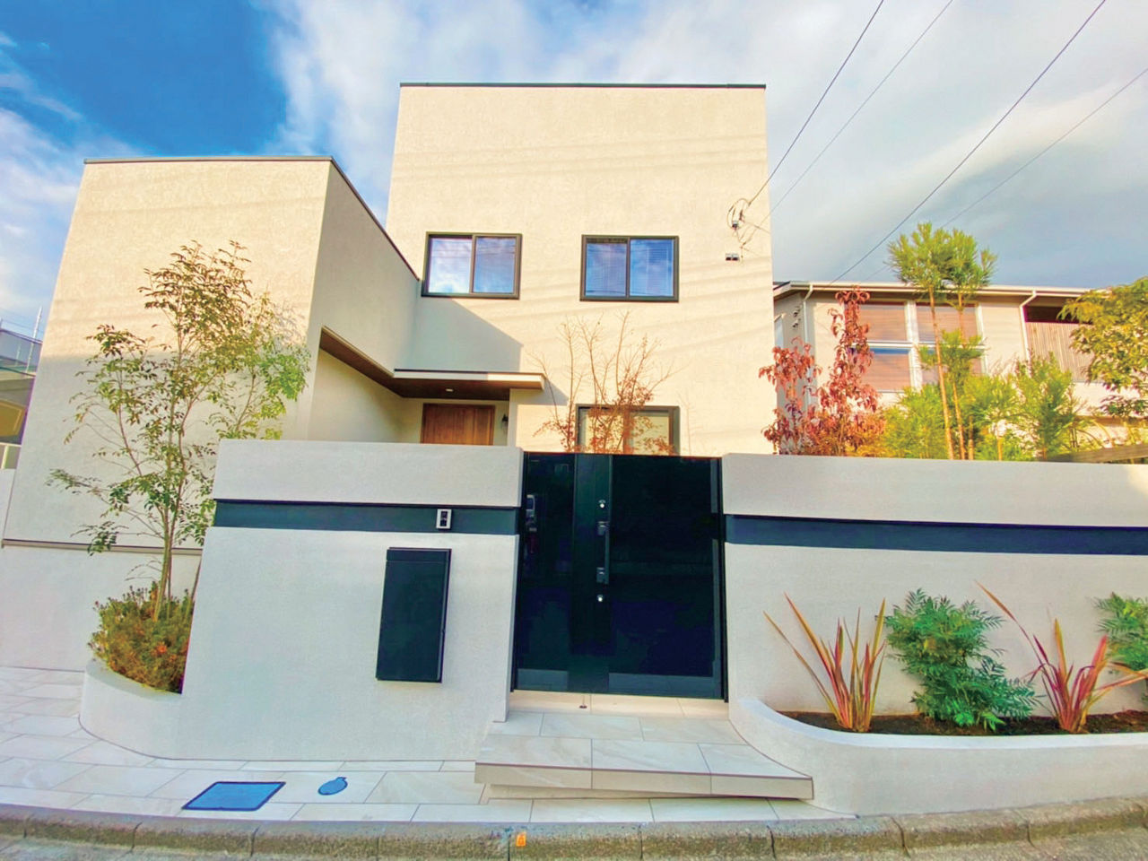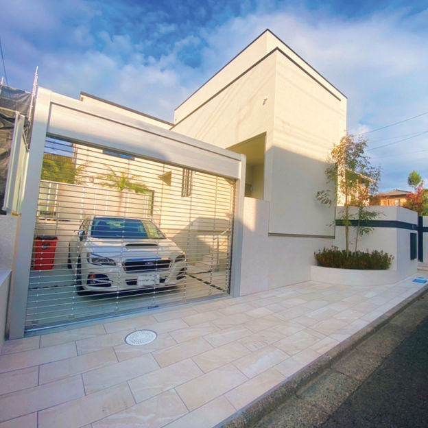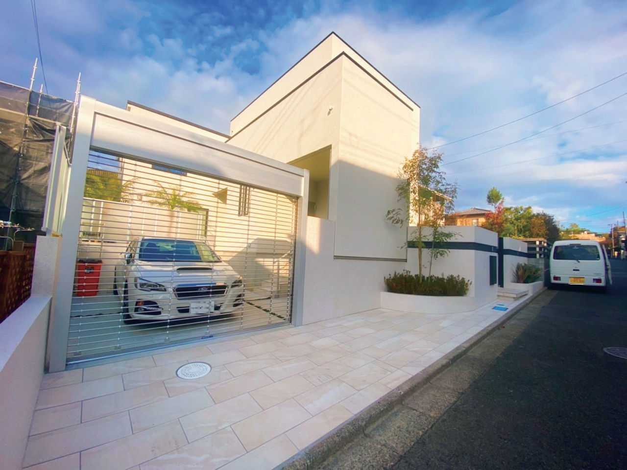 高級感漂うクローズドスタイルの外構。直線を基調に一体感のある外観を構築しながらも、植栽スペースに丸みを帯びた意匠を取り入れ、アクセントに。ガレージシャッターをやや奥まった位置に設置したことで、立体感も生まれています。
