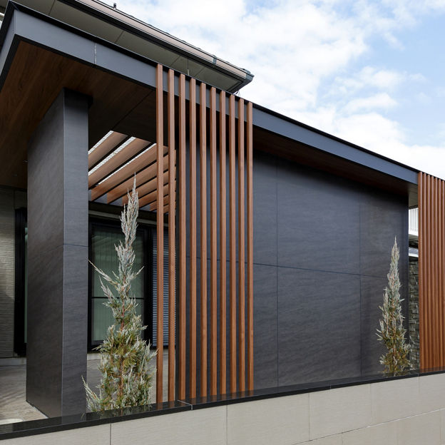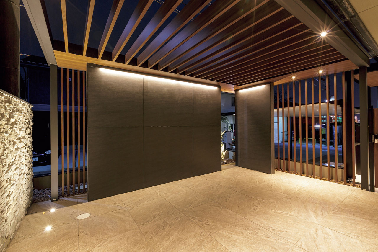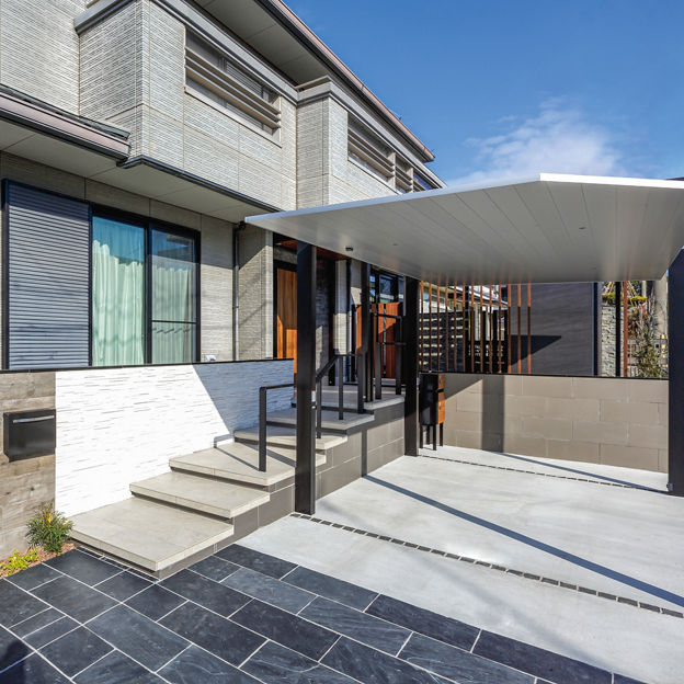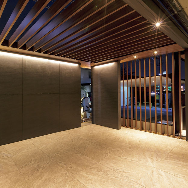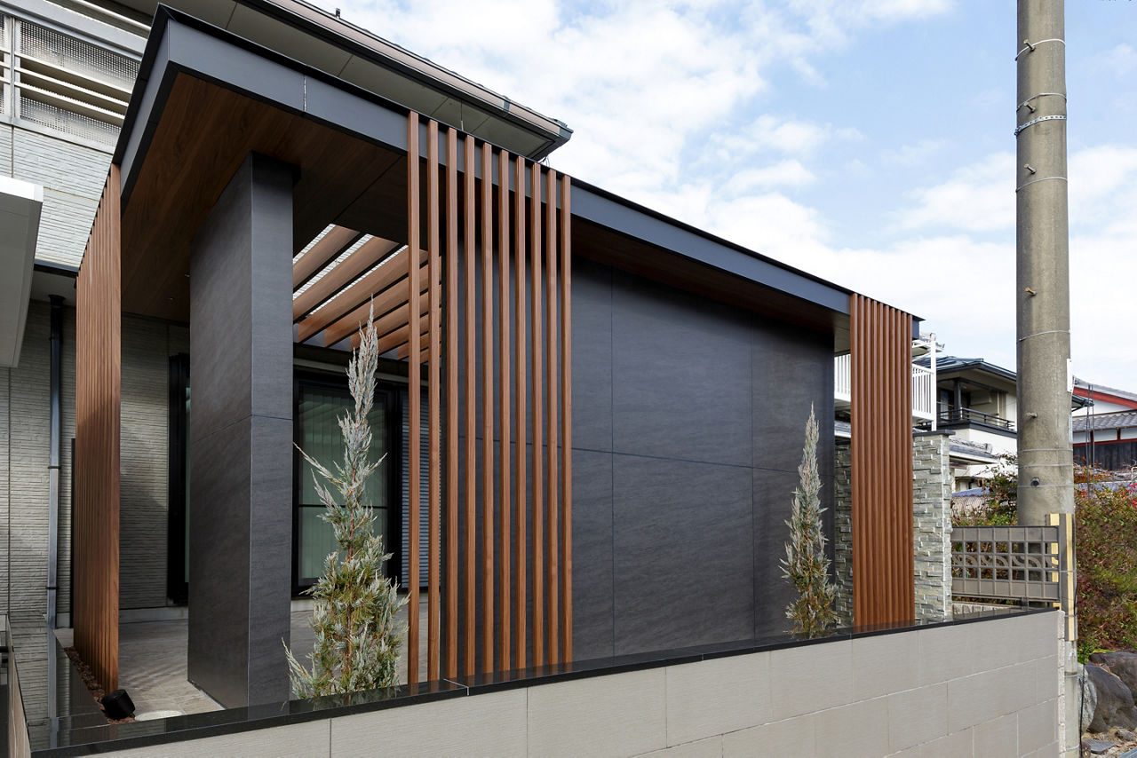 庭の印象を一新する上質なテラスをデザイン。L字に配置したGウォール セラミックタイルの重厚感と、デザイン格子の抜け感によって、モダンな佇まいを実現しています。カースペースにはフラットな屋根が特徴のカーポートSCを設置しスタイリッシュな空間になりました。
