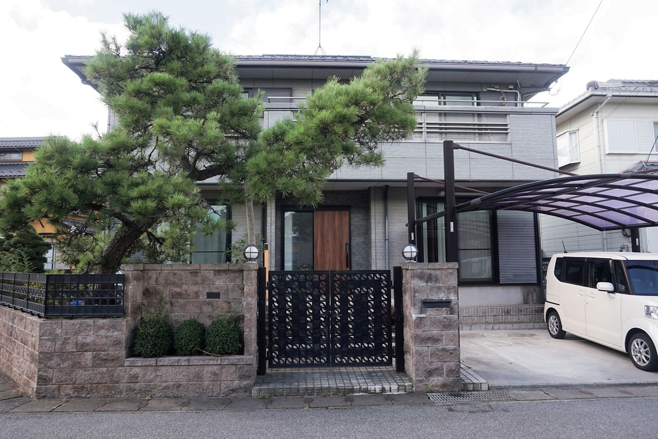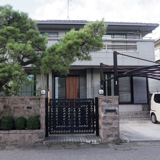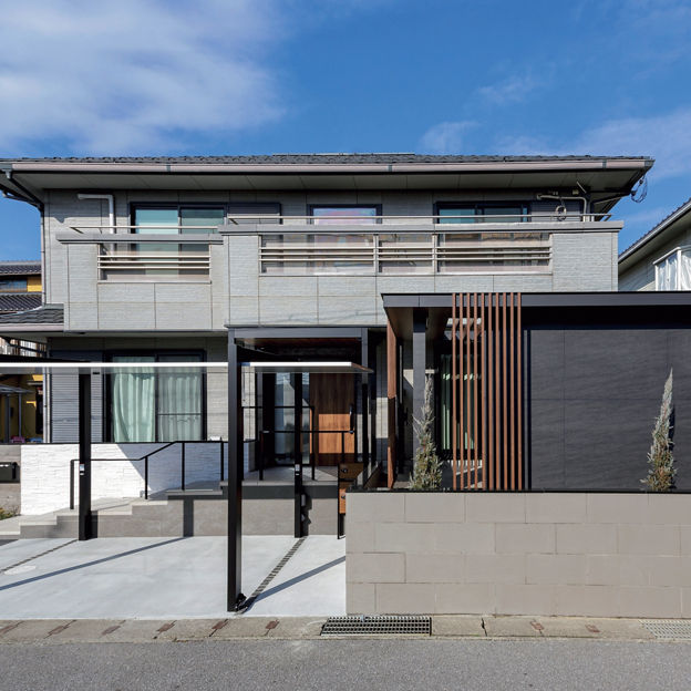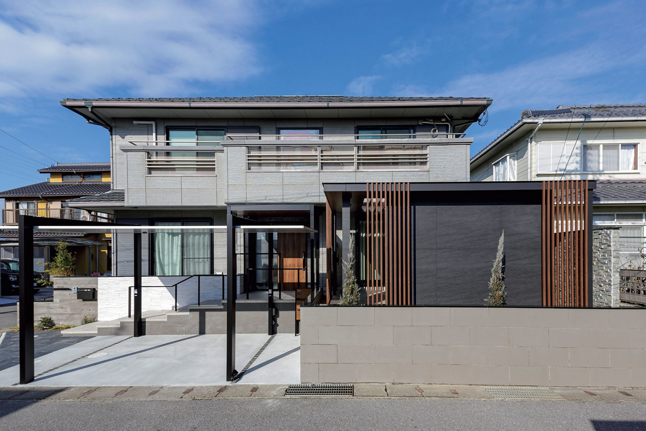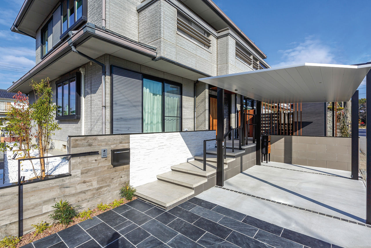庭の印象を一新する上質なテラスをデザイン。L字に配置したGウォール セラミックタイルの重厚感と、デザイン格子の抜け感によって、モダンな佇まいを実現しています。カースペースにはフラットな屋根が特徴のカーポートSCを設置しスタイリッシュな空間になりました。