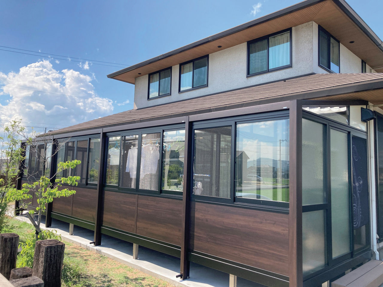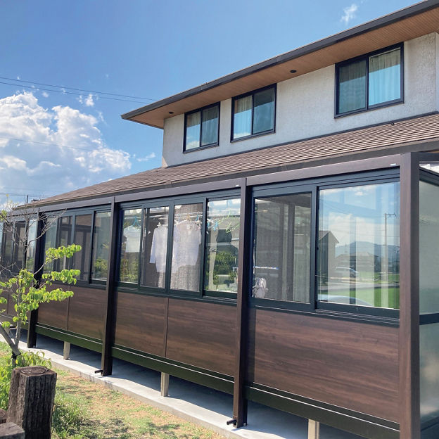 ガーデンルームGFを4連棟で設置し、一体感のあるスペースに。活用の幅を広げるため、ガーデンルームの内部を区切っています。雨の日の遊び場だけでなく、物干しスペース、憩いのスペースなどマルチに使えます。