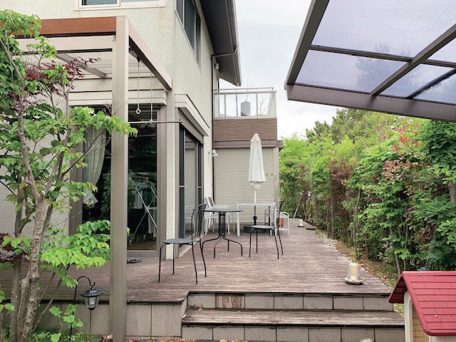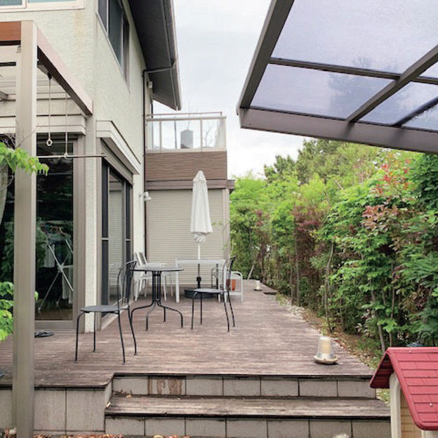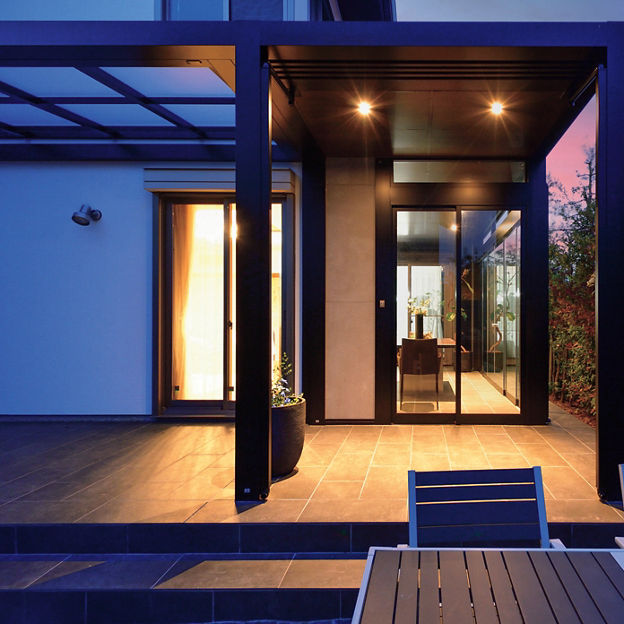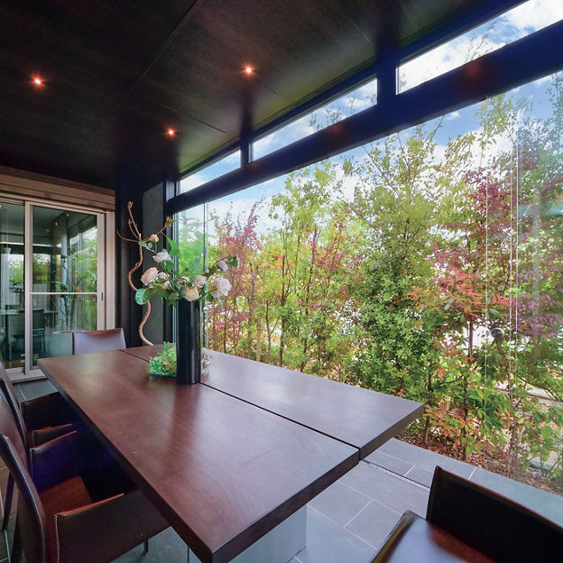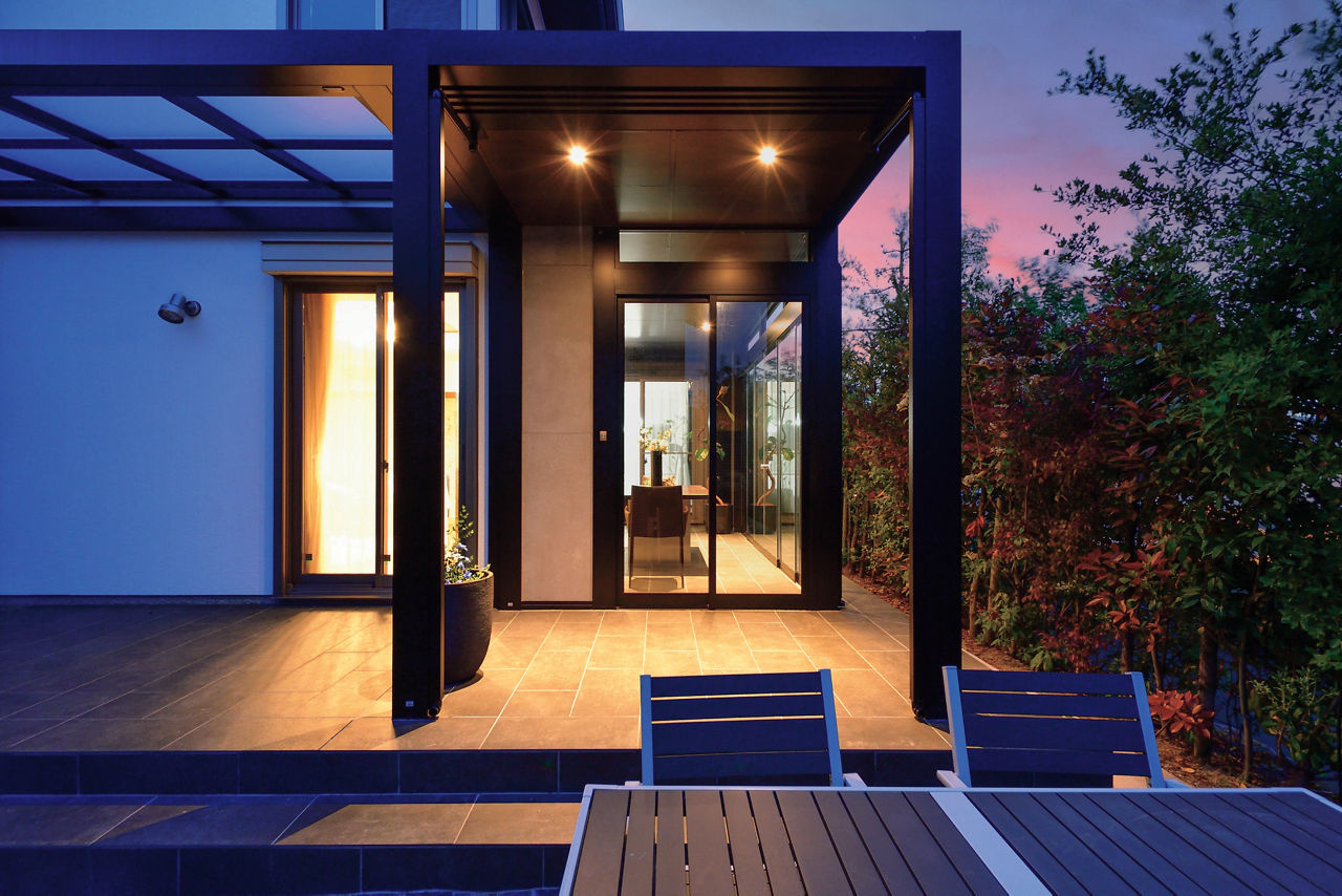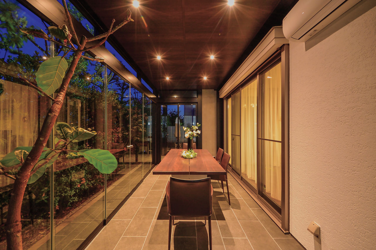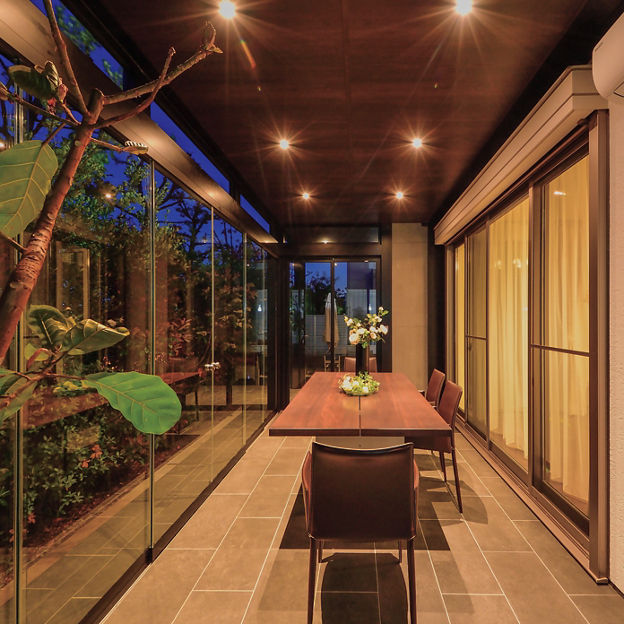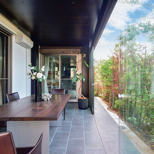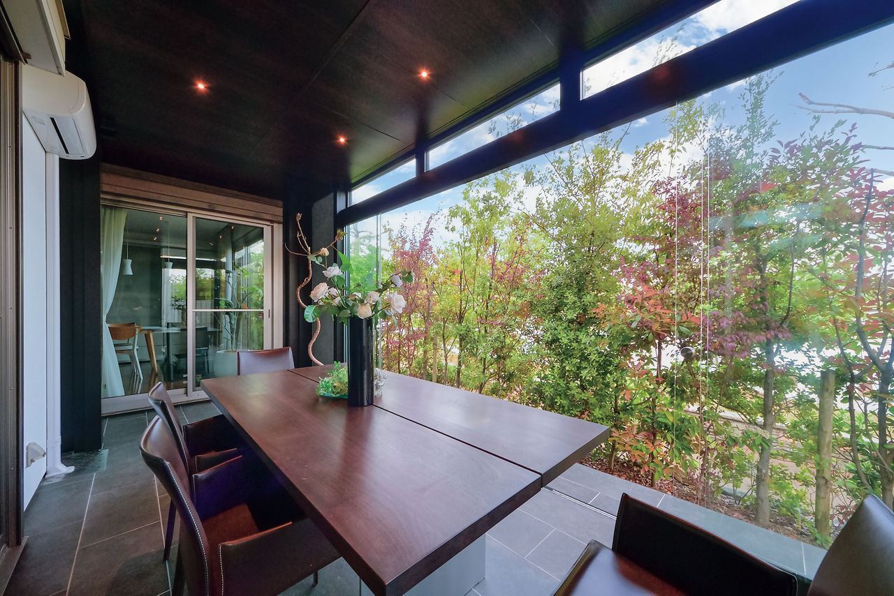 大判のガラス引戸を備えたテラスはプラスGでデザイン。ガラスで囲うことで、圧迫感がなく外のグリーンを楽しめます。建物に沿わせてL字で設計することで、どの部屋からも出入りがしやすい動線に。