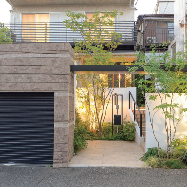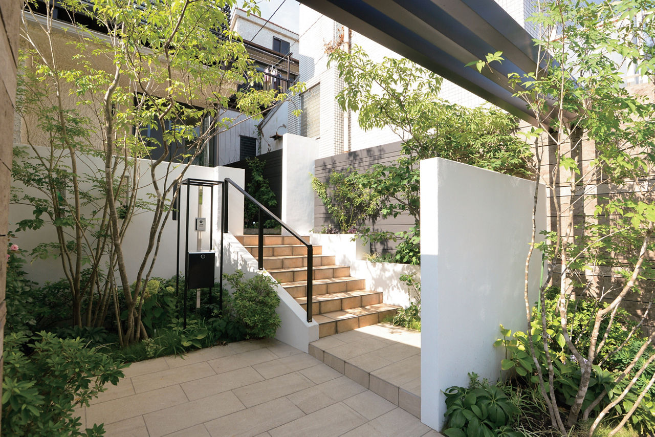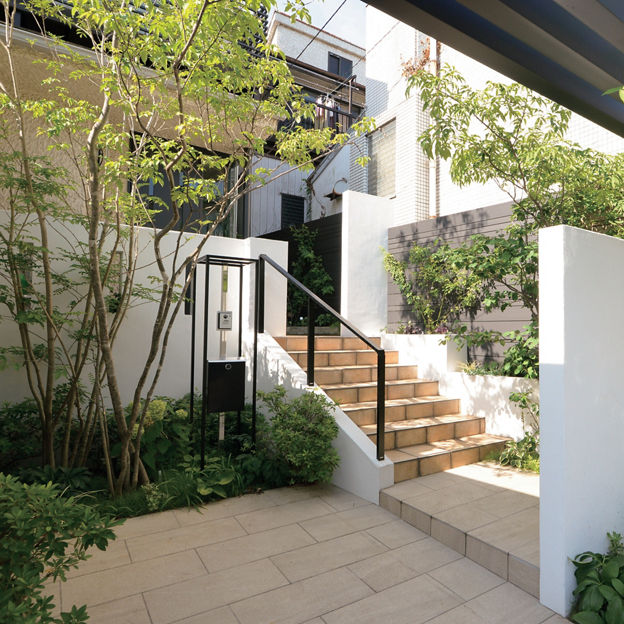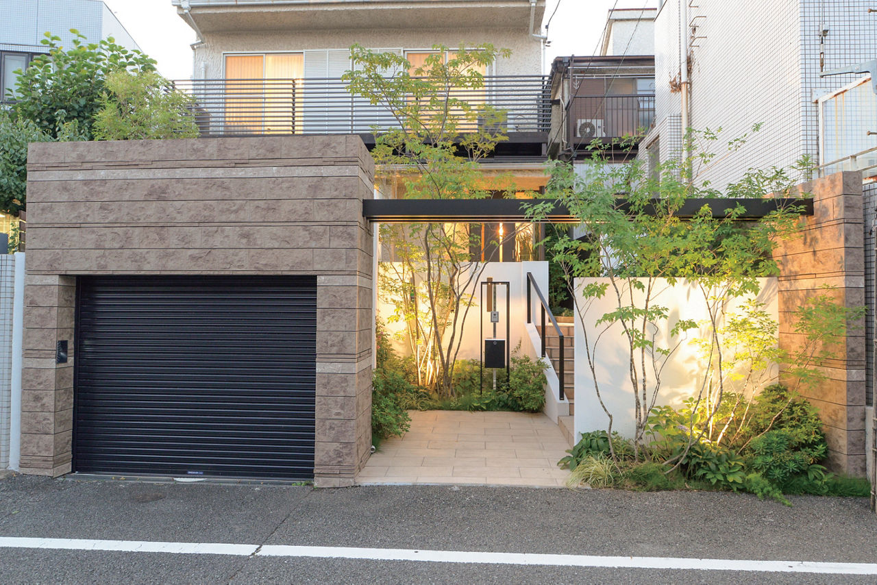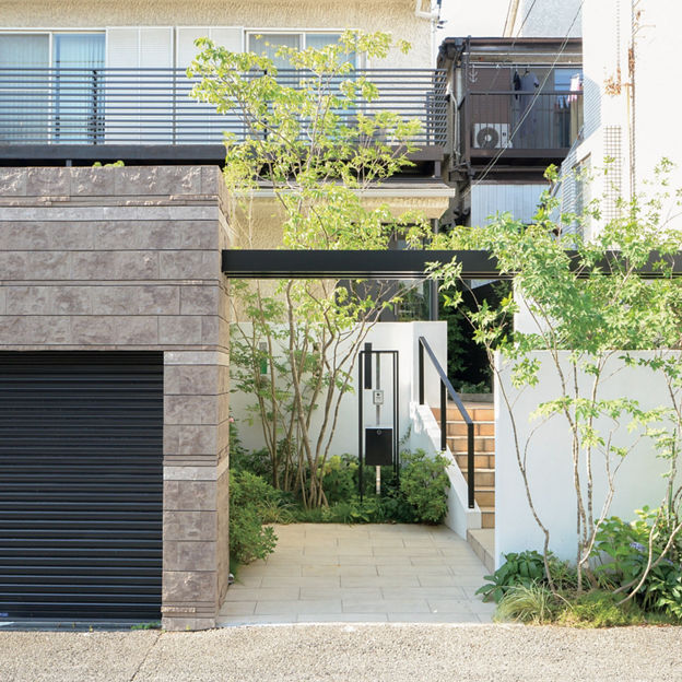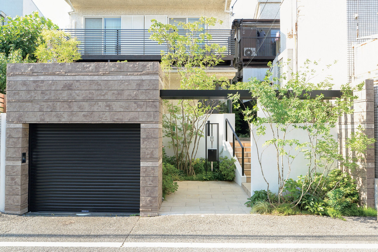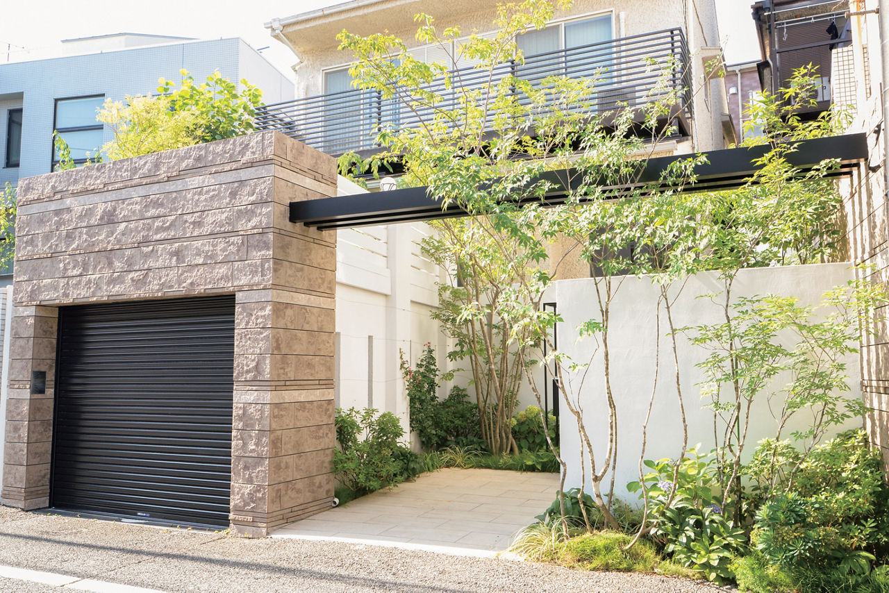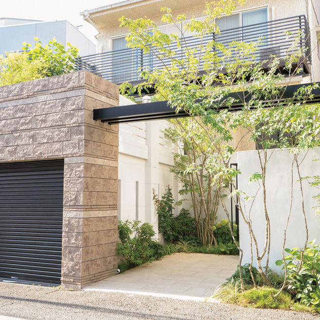 エントランスの上部にフレームを架けて、シンプルなアーチを形成。背丈の高いシャッターゲートと塀の分離を防ぎ、全体のバランスをとっています。門袖と植栽の位置を工夫し、奥行きを感じられるアプローチに。