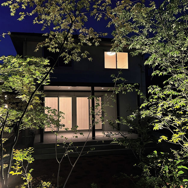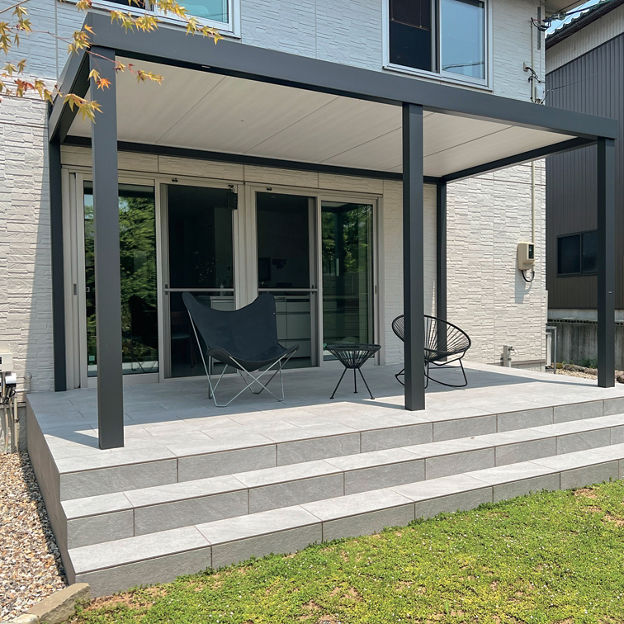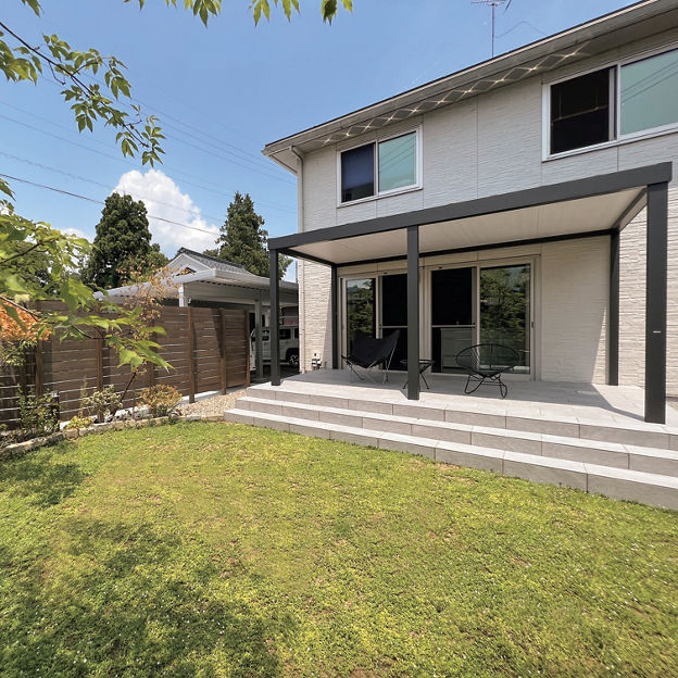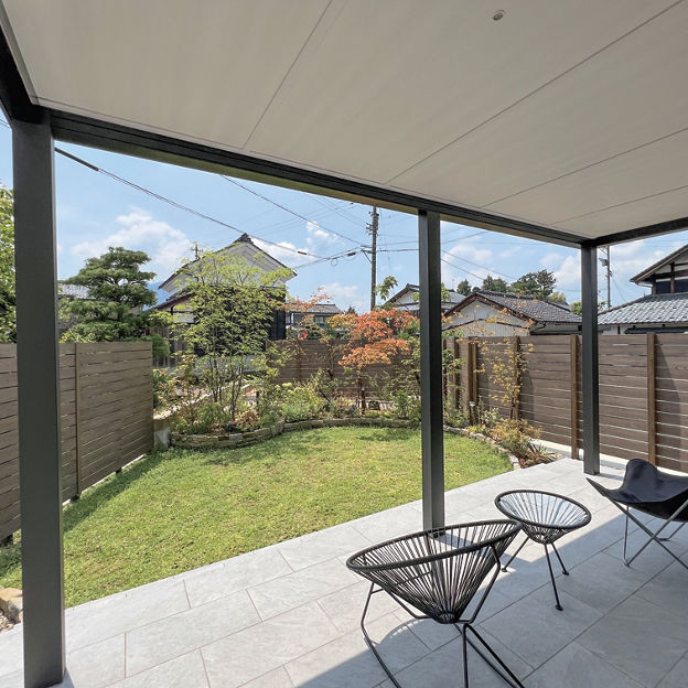リビング前にガーデンルームを設置。内天井付きのテラスタイプによって、リビングに日差しが入り込まず、カーテンがなくても快適に過ごせます。タイルデッキは室内の床と高さを揃え、スムーズな行き来を可能にしました。