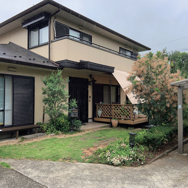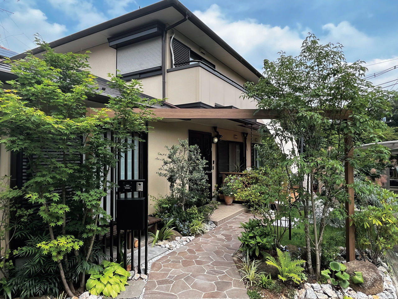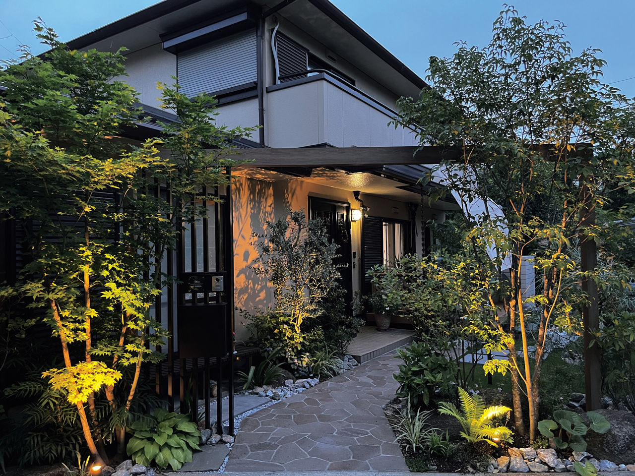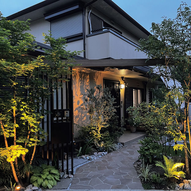 プラスG アーチファンクションと植栽によって、外からの視線がさりげなくカットされたエントランス。玄関につながる石張りのアプローチも奥行きを感じさせる仕上がりに。照明で照らし出された植栽のシルエットが夜の街並みに映えます。