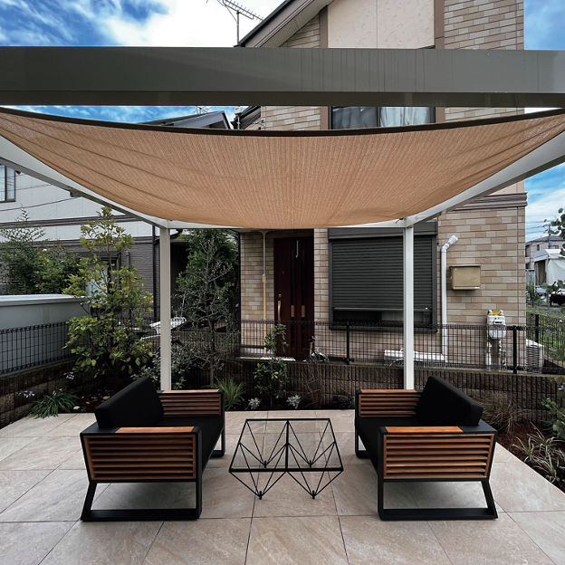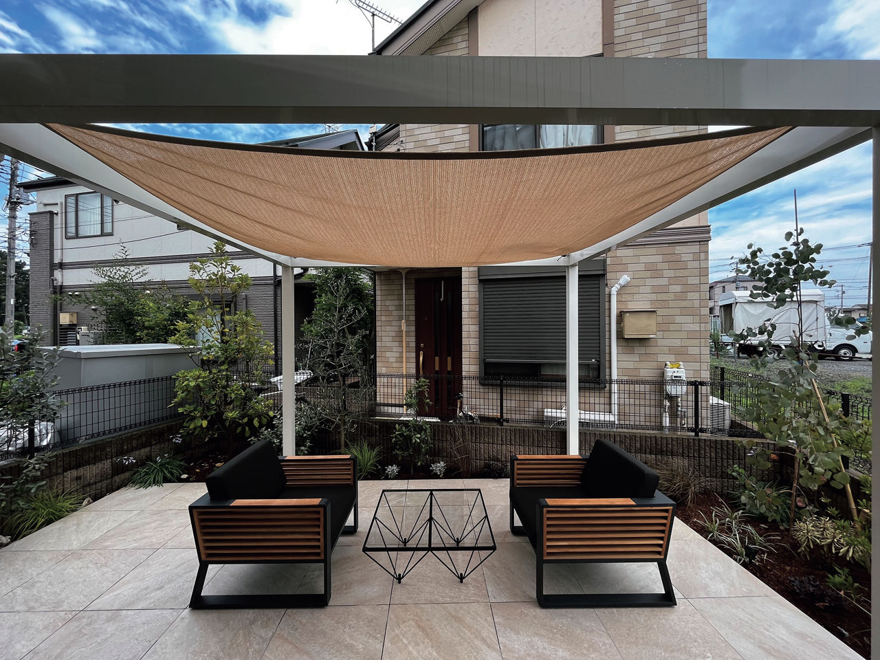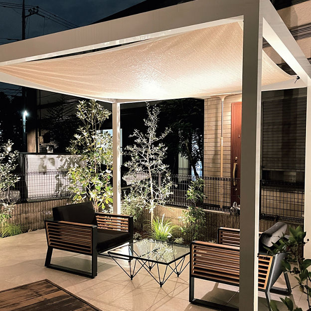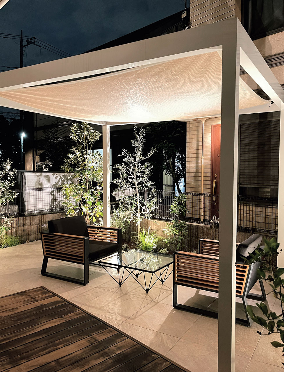 プラスGでタイル仕上げのテラスをもうひとつのリビングに。リビングと庭がゆるやかにつながり、夏でも快適に過ごせる空間です。庭に植えられた木々を照らす照明が非日常感を演出します。