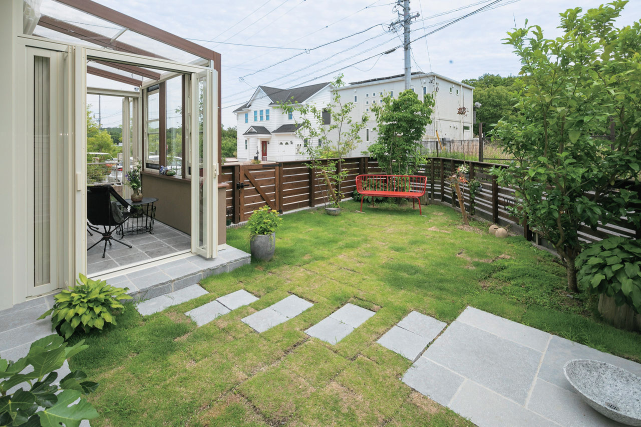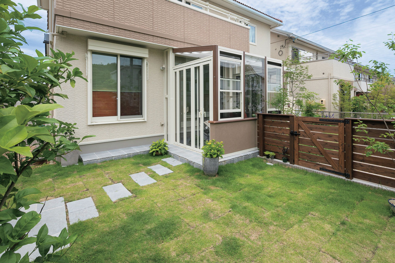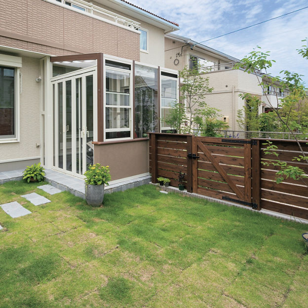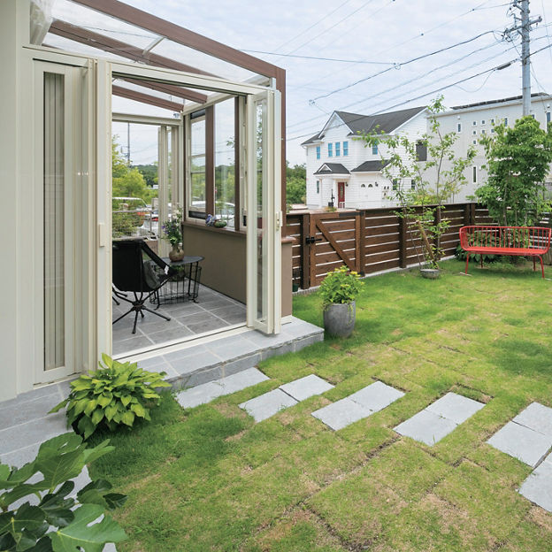 リビングと庭をゆるやかにつなげるため、腰壁タイプのガーデンルーム ココマを設置。気になる外からの視線は植栽で自然に目隠しを。フェンスで隔てられた庭と駐車場をガーデンルームでつなぐことでスムーズな導線を実現しています。
