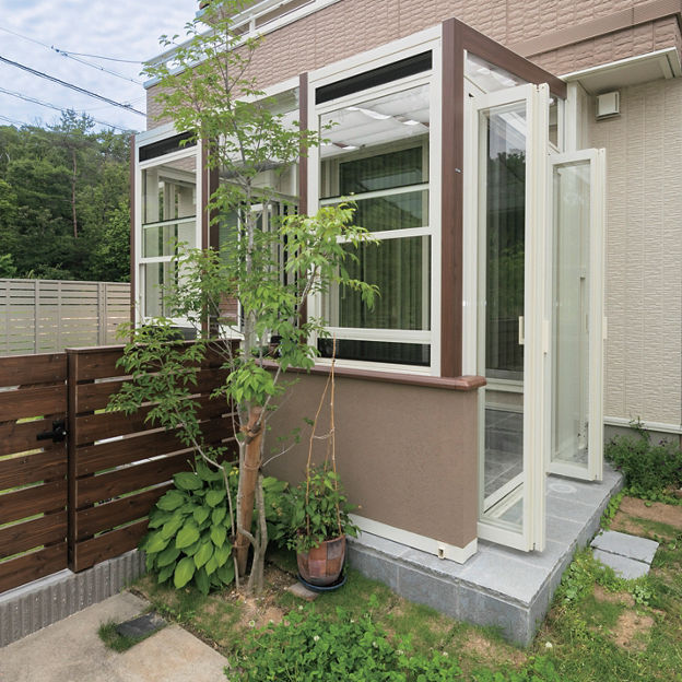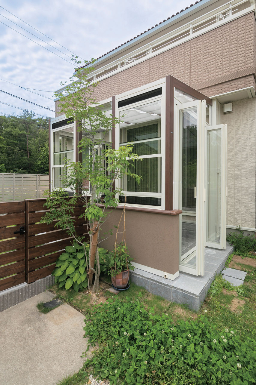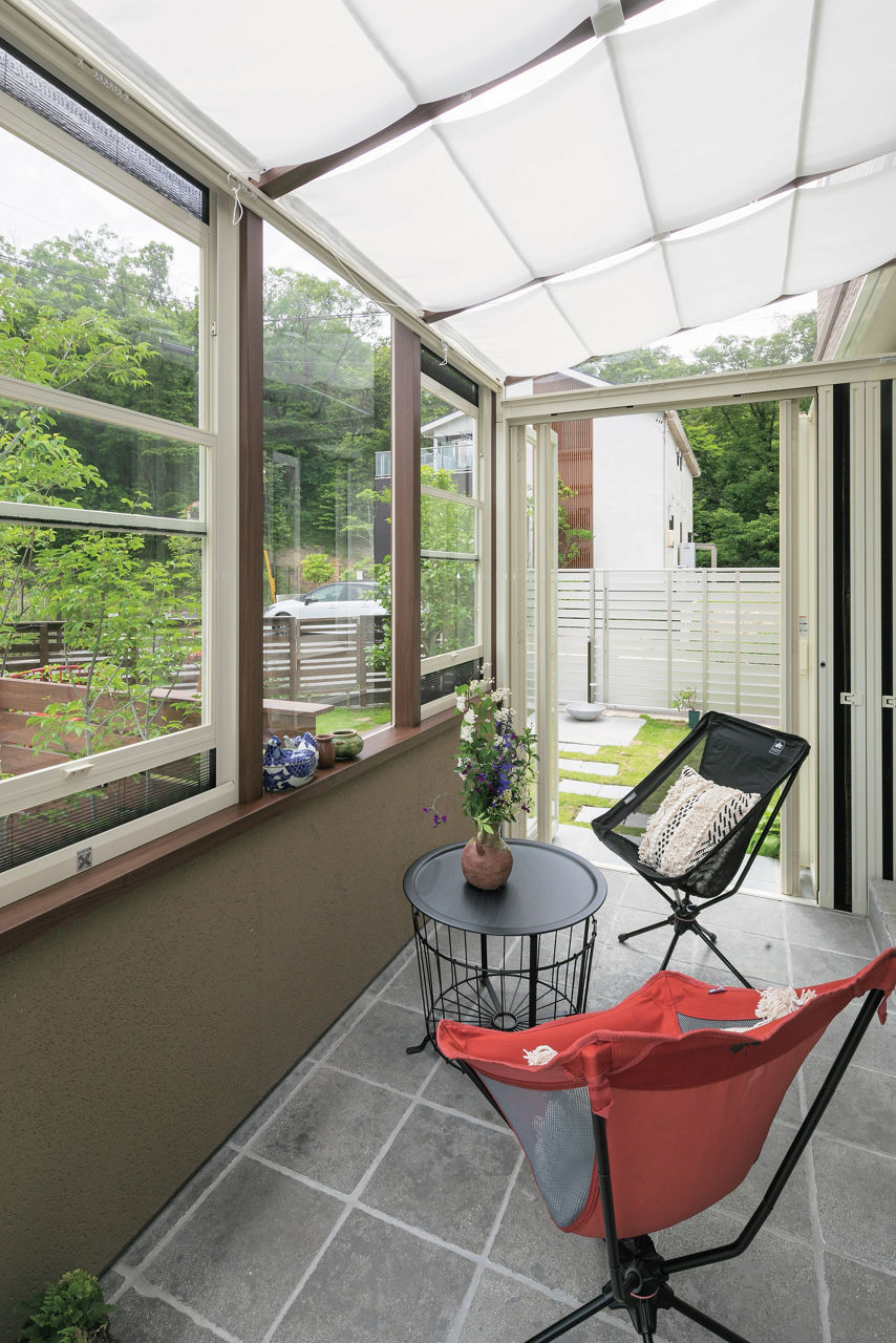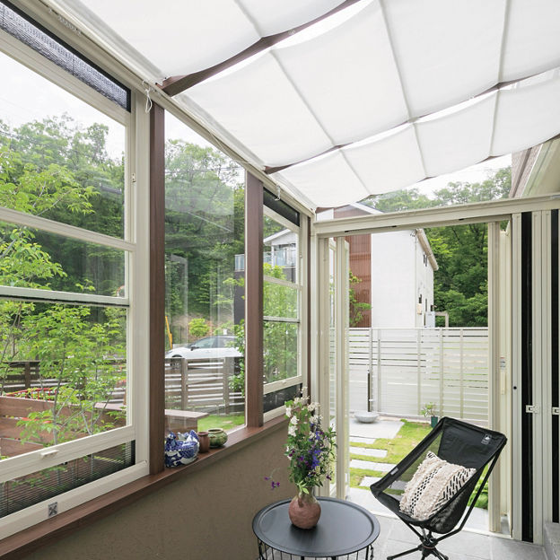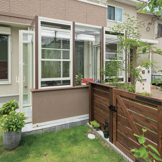 リビングと庭をゆるやかにつなげるため、腰壁タイプのガーデンルーム ココマを設置。気になる外からの視線は植栽で自然に目隠しを。フェンスで隔てられた庭と駐車場をガーデンルームでつなぐことでスムーズな導線を実現しています。