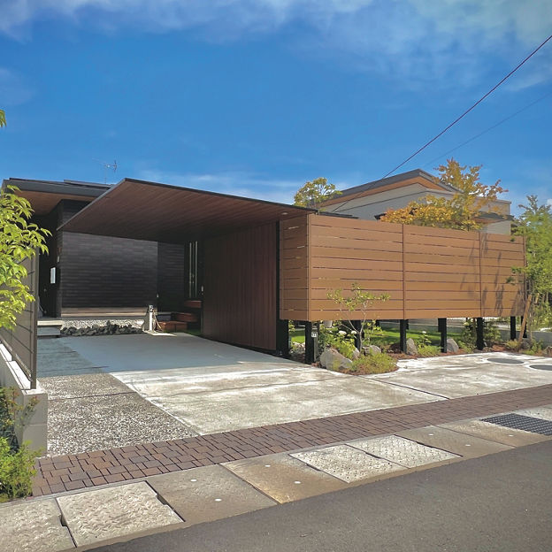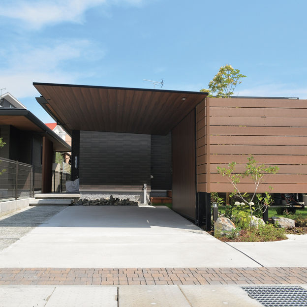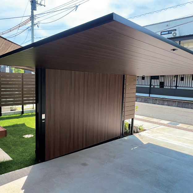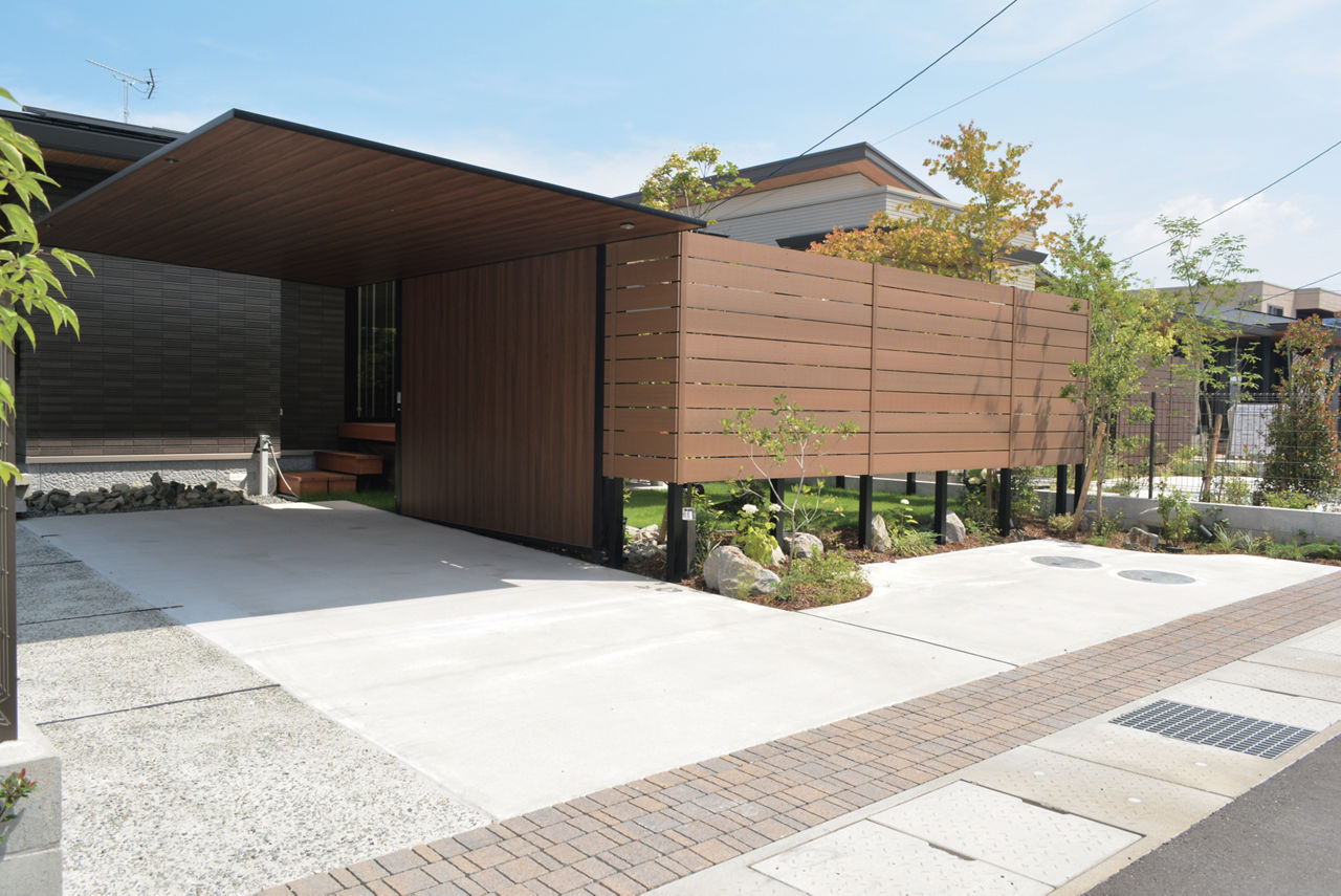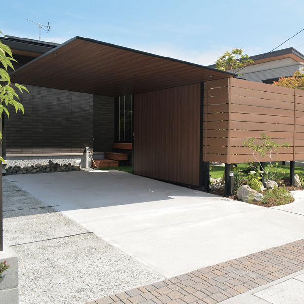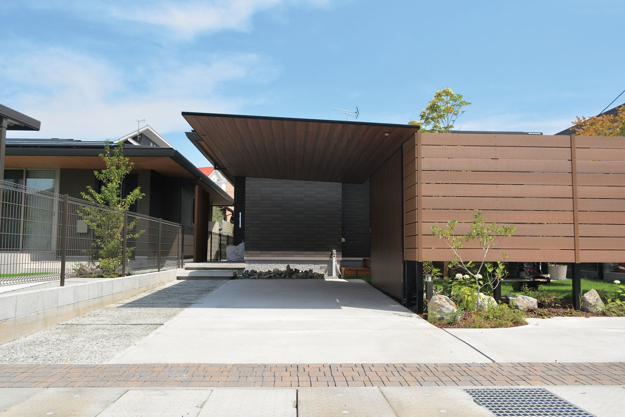 カースペースにカーポートSCを設置。木調色の天井面に木目が施されたGウォール ラッピングボードをコーディネートすることで、カーポートと一体化したナチュラルテイストの目隠しに。庭空間のプライバシー確保に貢献しています。