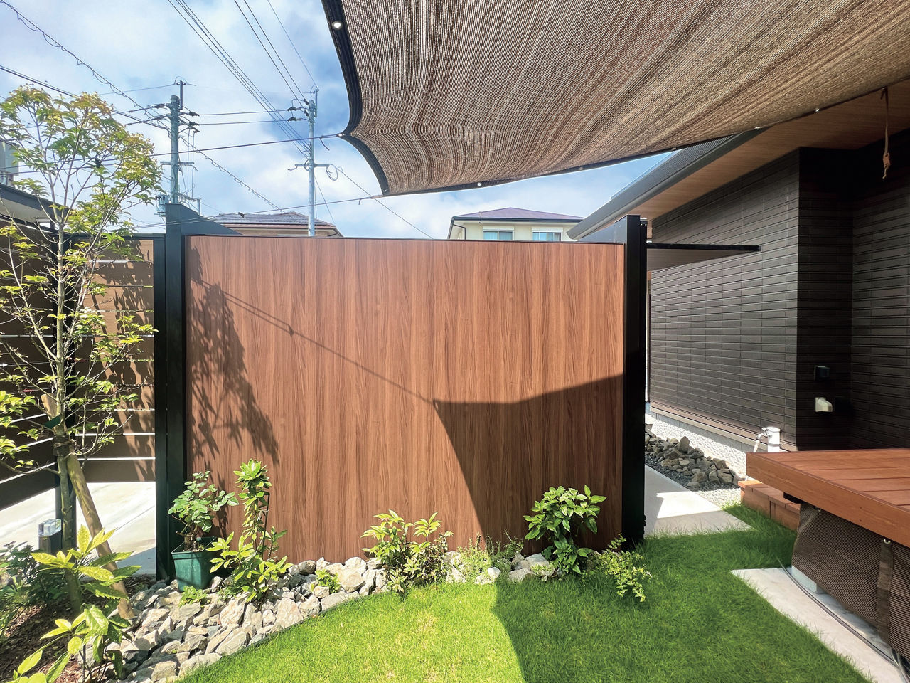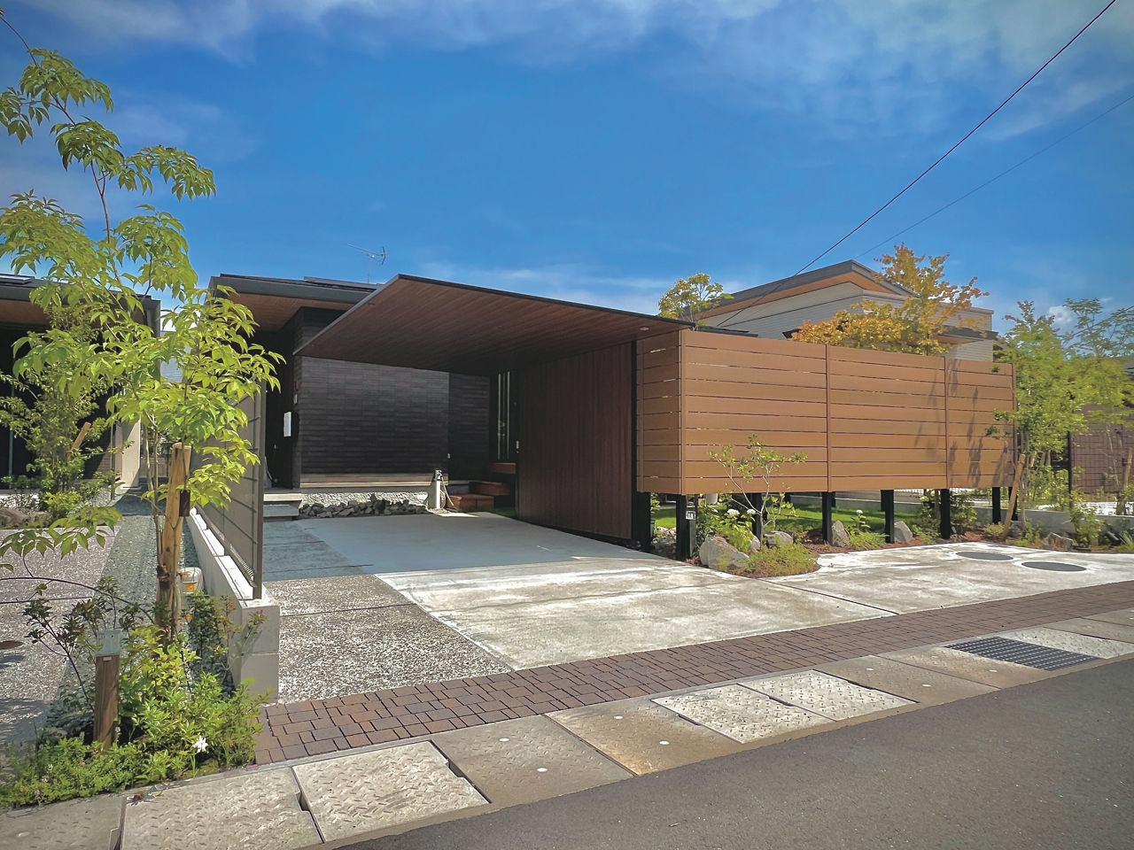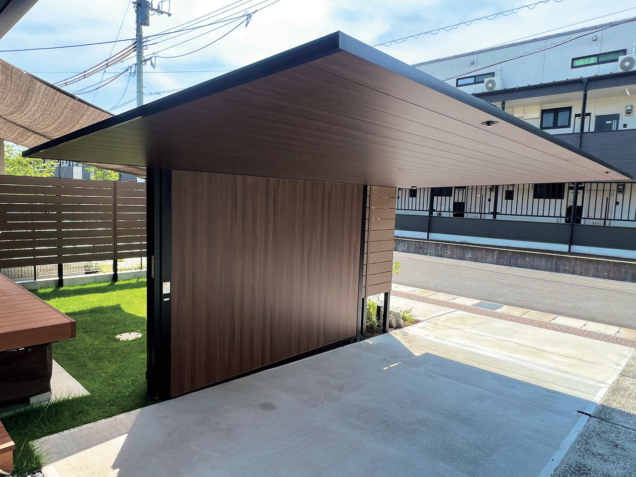 カースペースにカーポートSCを設置。木調色の天井面に木目が施されたGウォール ラッピングボードをコーディネートすることで、カーポートと一体化したナチュラルテイストの目隠しに。庭空間のプライバシー確保に貢献しています。