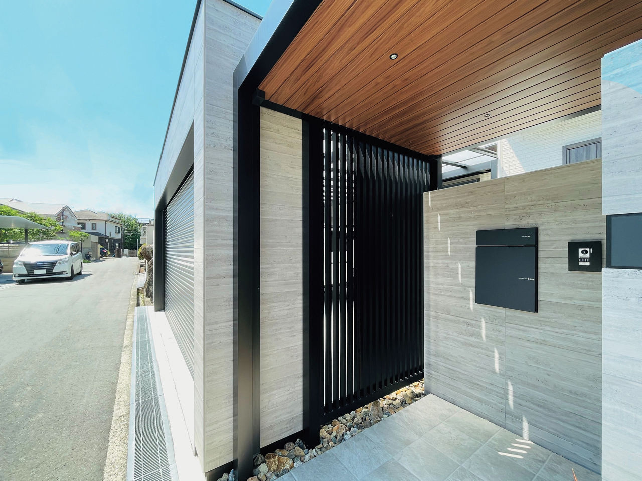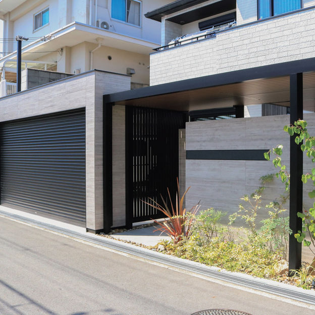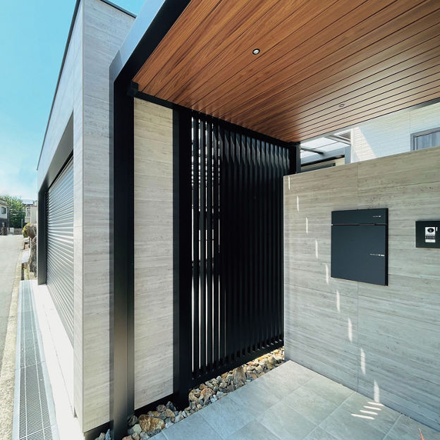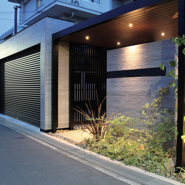 シャッターゲートでセキュリティ効果を高めたクローズドスタイルの外構。屋根のあるアプローチはGルーフでデザイン。木調の天井材が建物の軒と調和し、夜間はダウンライトが高級感を漂わせています。