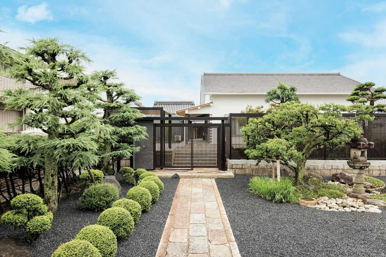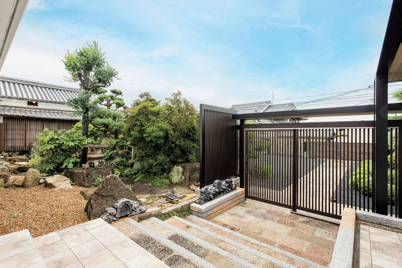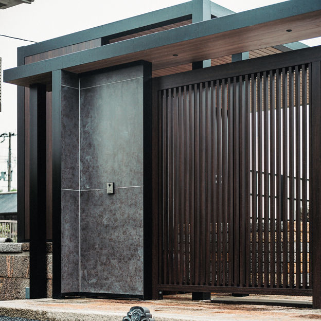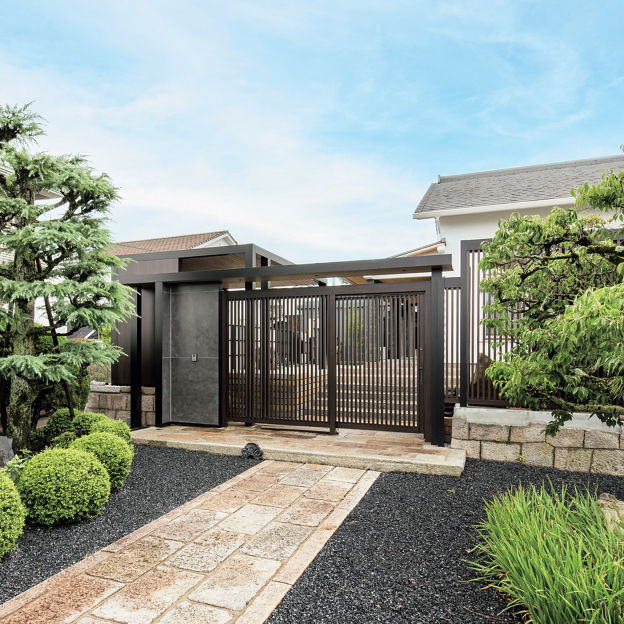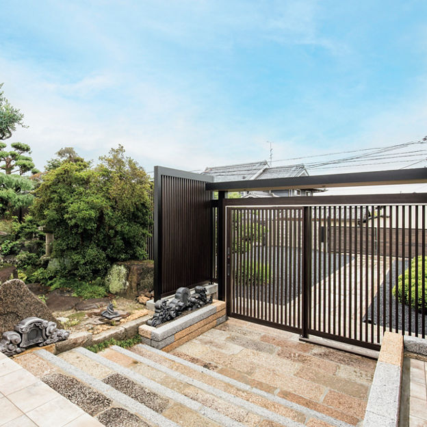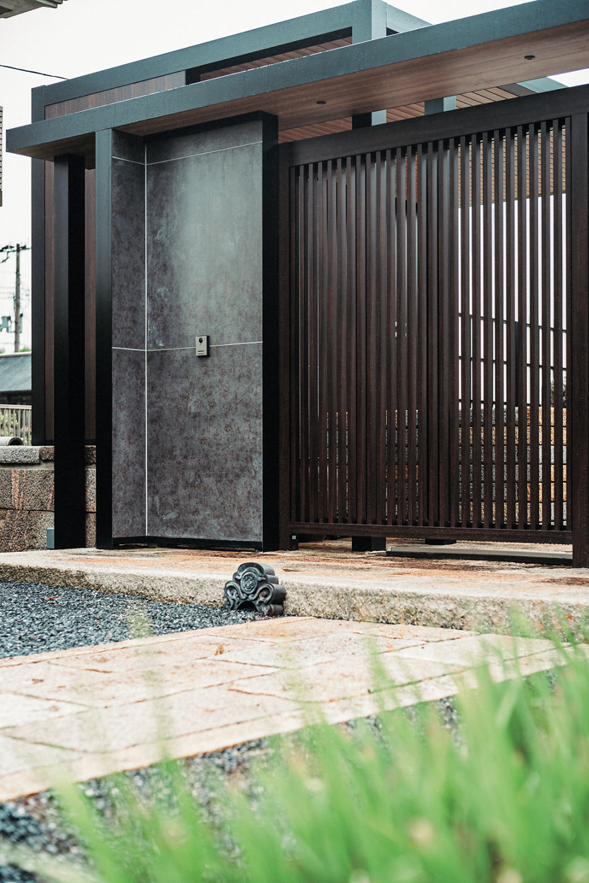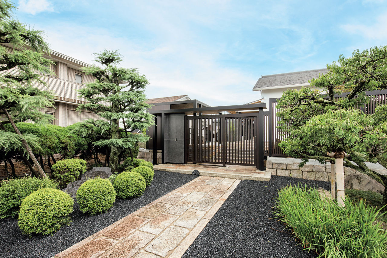情緒のある庭を引き立てる、和モダンテイストの外構をプラスGでデザイン。縦格子の意匠がほどよい目隠し効果とともに抜け感を演出。クローズドスタイルの外構の重厚なイメージを軽減しています。