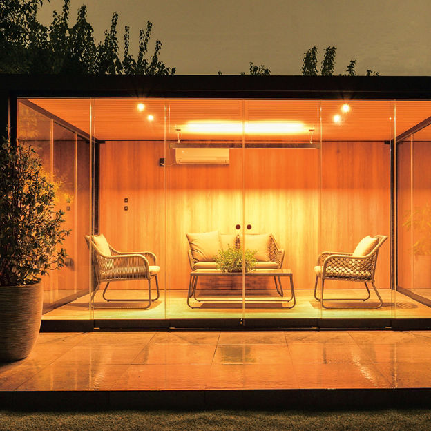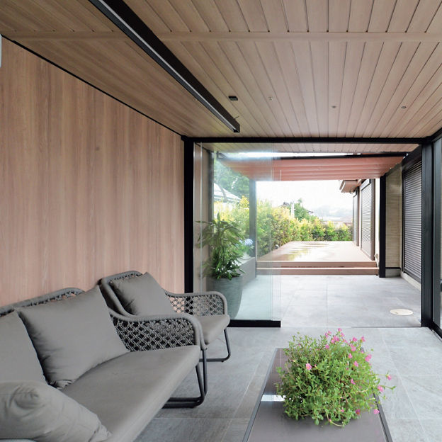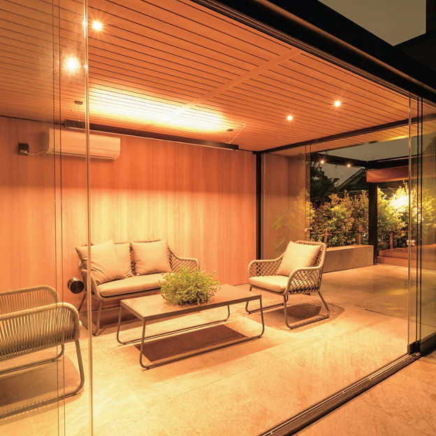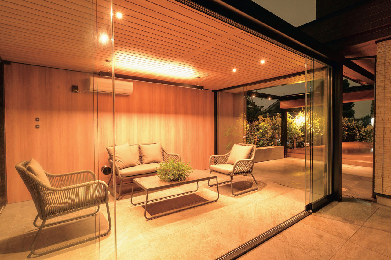 プラスGでガラス張りの「離れ」をデザイン。ガラス引戸をフルクローズすれば居住性が高まり、サイドを開け放てば自由な行き来が可能です。時間や季節を問わずに利用できるよう、照明とともにエアコンも完備しています。お友達やご家族など大勢の方が集まる場所にぴったりです。