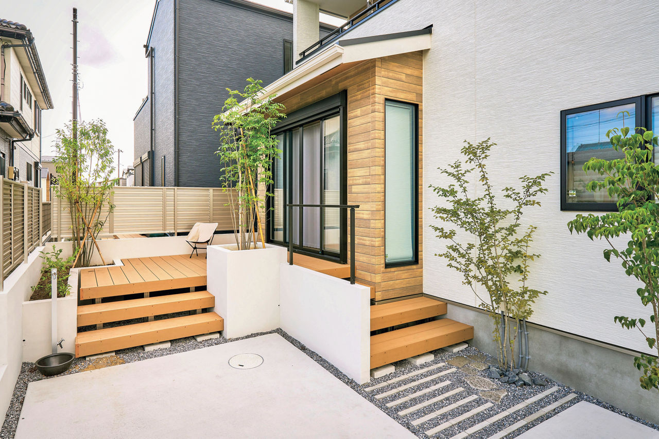 近隣との交流を重視した、オープンスタイルの外構をデザイン。開放感とくつろぎに満ちたデッキスペースは、もうひとつのリビングとして日常生活はもちろん、災害時の屋外避難にも活用できます。