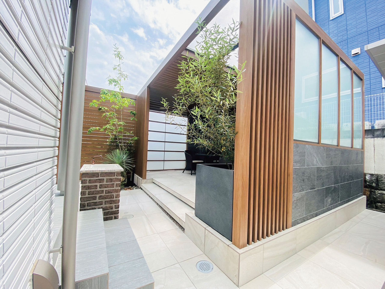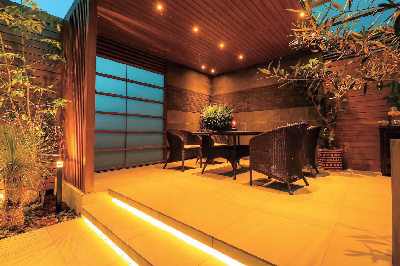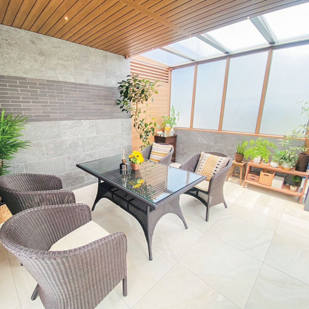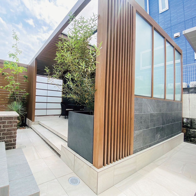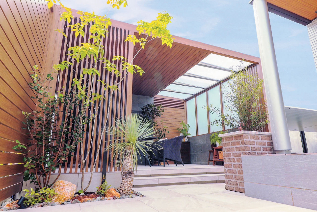プラスGで囲われる安心感と開放感を両立した、隠れ家のような空間をデザイン。天井材は全面張りにせず、採光性のある屋根材を取り付けることで、空間内にほどよい明るさがもたらされています。