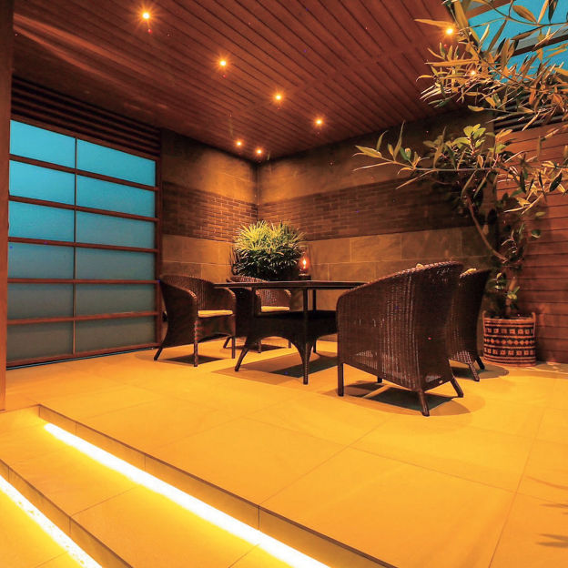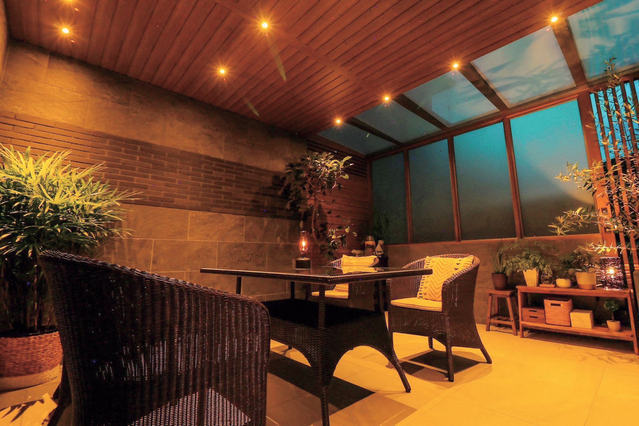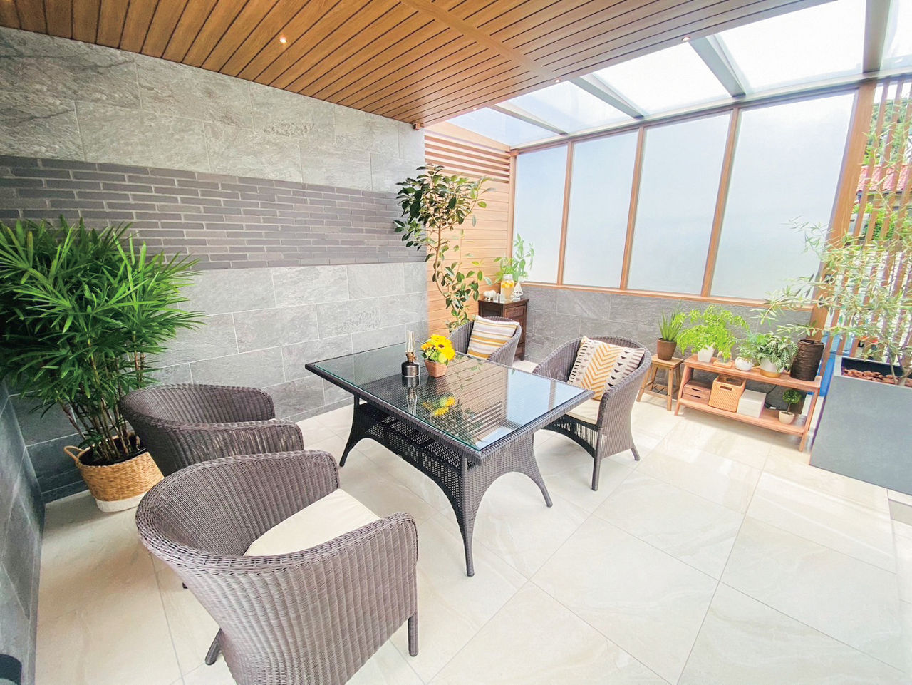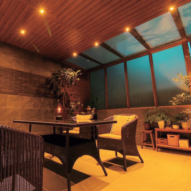 プラスGで囲われる安心感と開放感を両立した、隠れ家のような空間をデザイン。天井材は全面張りにせず、採光性のある屋根材を取り付けることで、空間内にほどよい明るさがもたらされています。