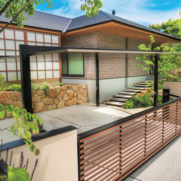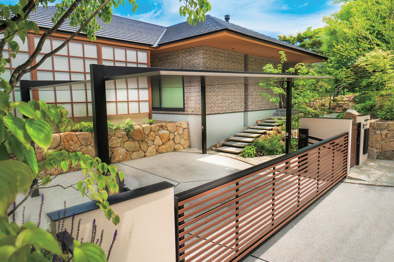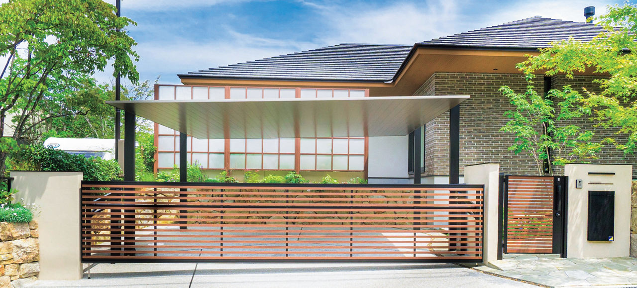 カーポートSCの木目調の屋根材が緑豊かなガーデンと調和。横格子の跳ね上げ門扉、目隠し効果と採光性を両立した角格子のスクリーンによって、重厚感をやわらげたクローズドスタイルの外構に仕上げています。