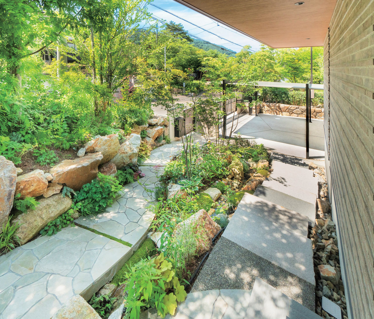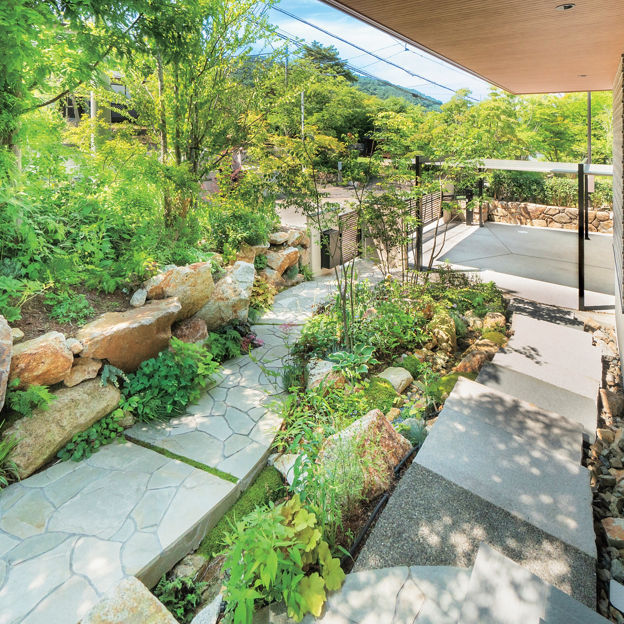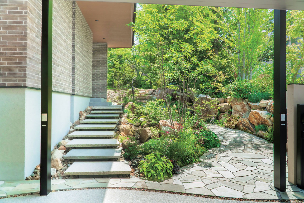 住宅や街並みになじむ車庫まわりや門扉など、帰宅するたびにホッとできる素敵な外構になりました。玄関までつづくアプローチが特にお気に入りです。