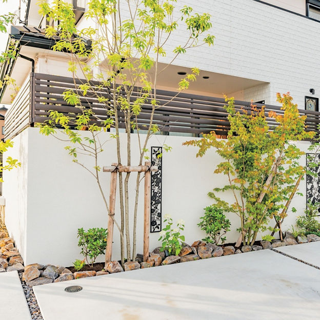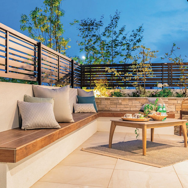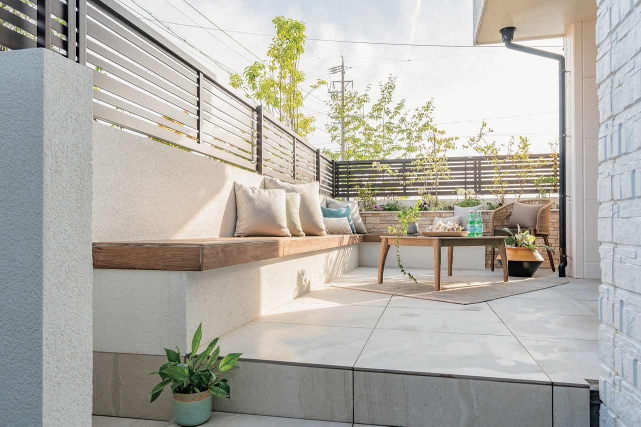 道路に面したデッキをくつろぎの空間に。目隠し用のフェンスは、造り付けのベンチに腰かけた時に外から見えにくい高さに設定。植栽と組み合わせ、明るい雰囲気のクローズドスタイルの外構に仕上げています。