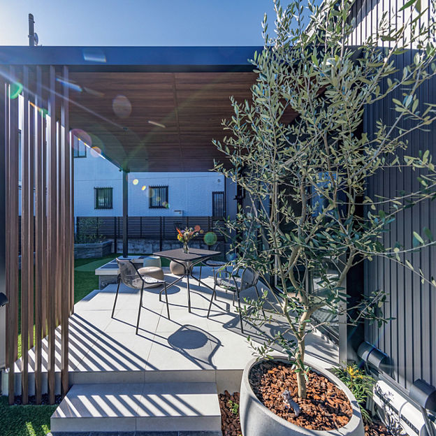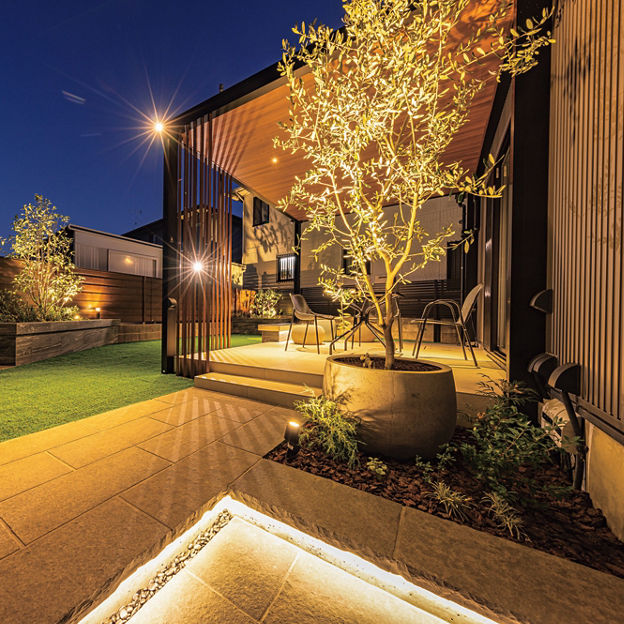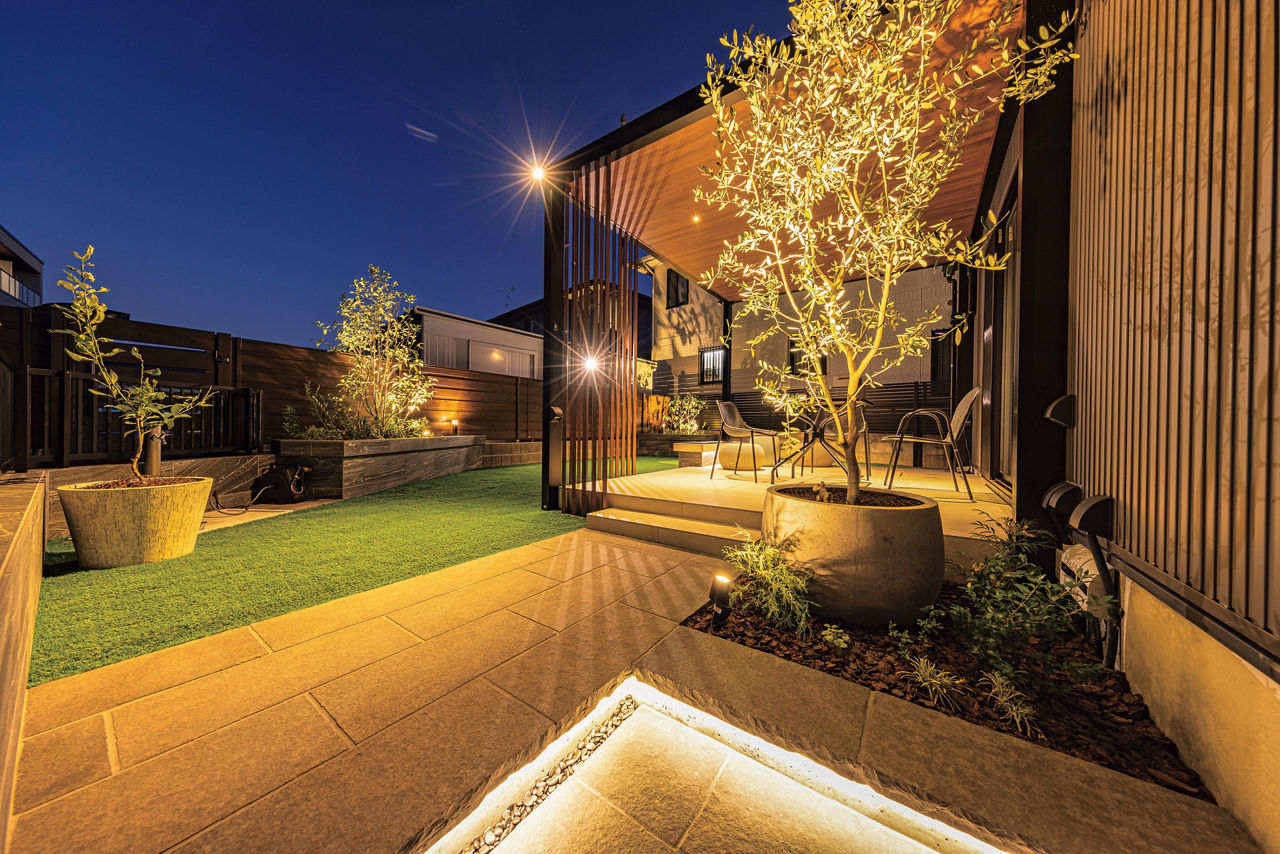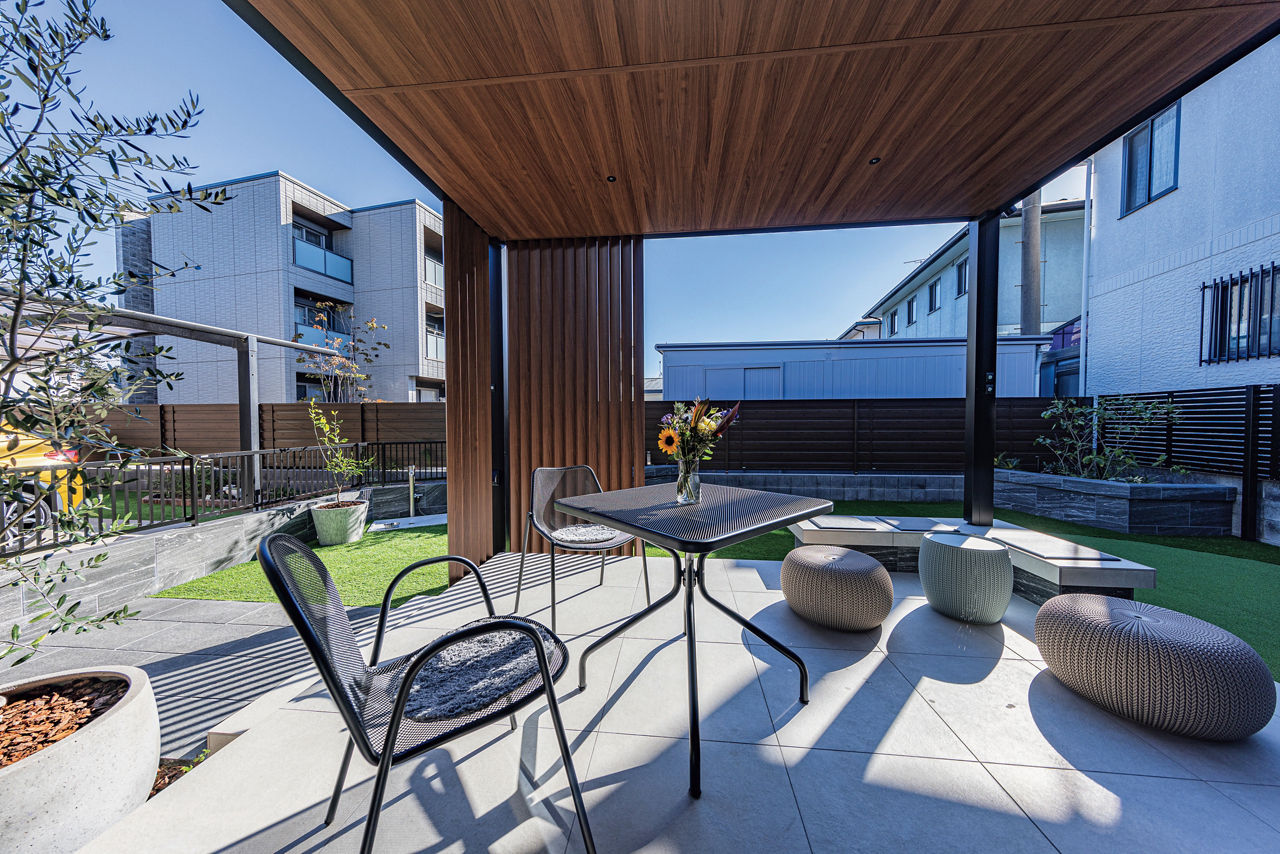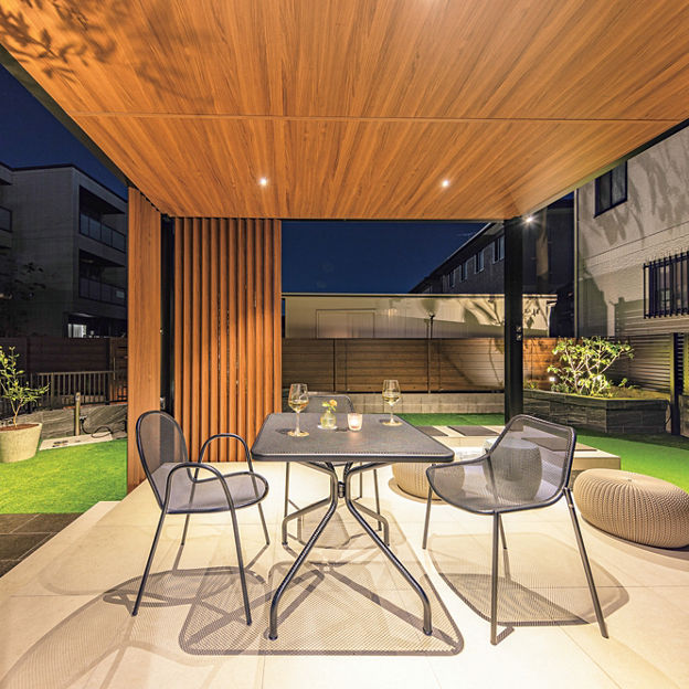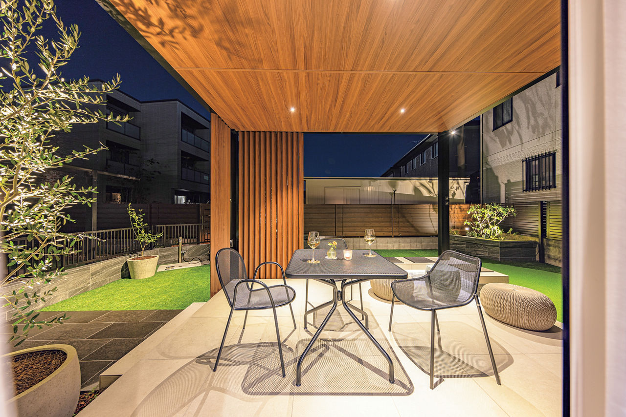 プラスGでガーデンにテラスをデザイン。目隠しと空間のアクセントを兼ねた縦格子のスクリーンをポイント的に配置。天井材にはダウンライトを取り付け、昼だけでなく、夜も楽しめるプライベート空間に仕上げています。