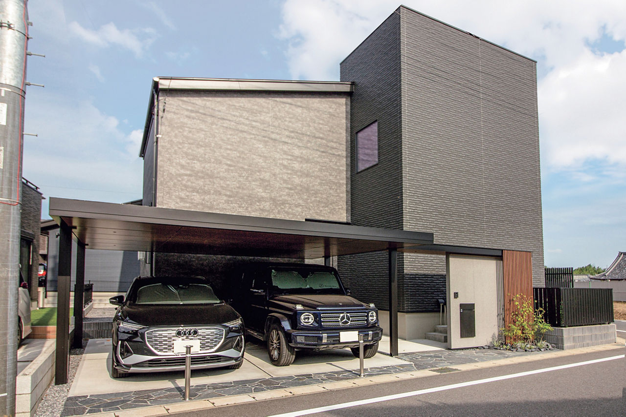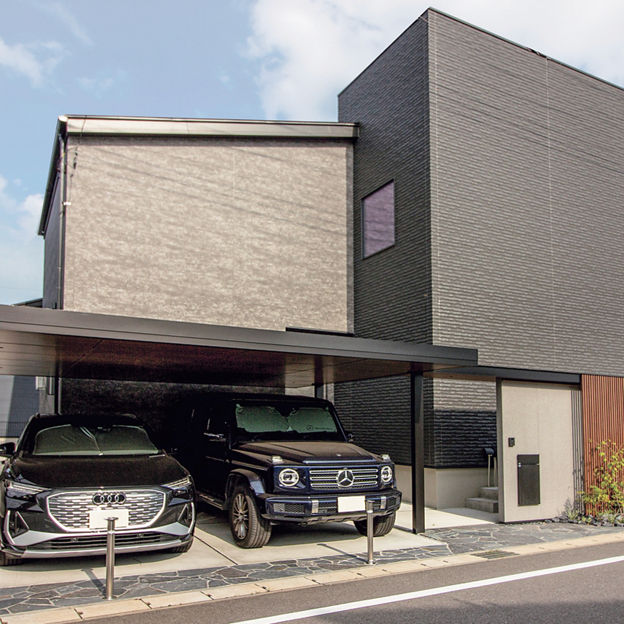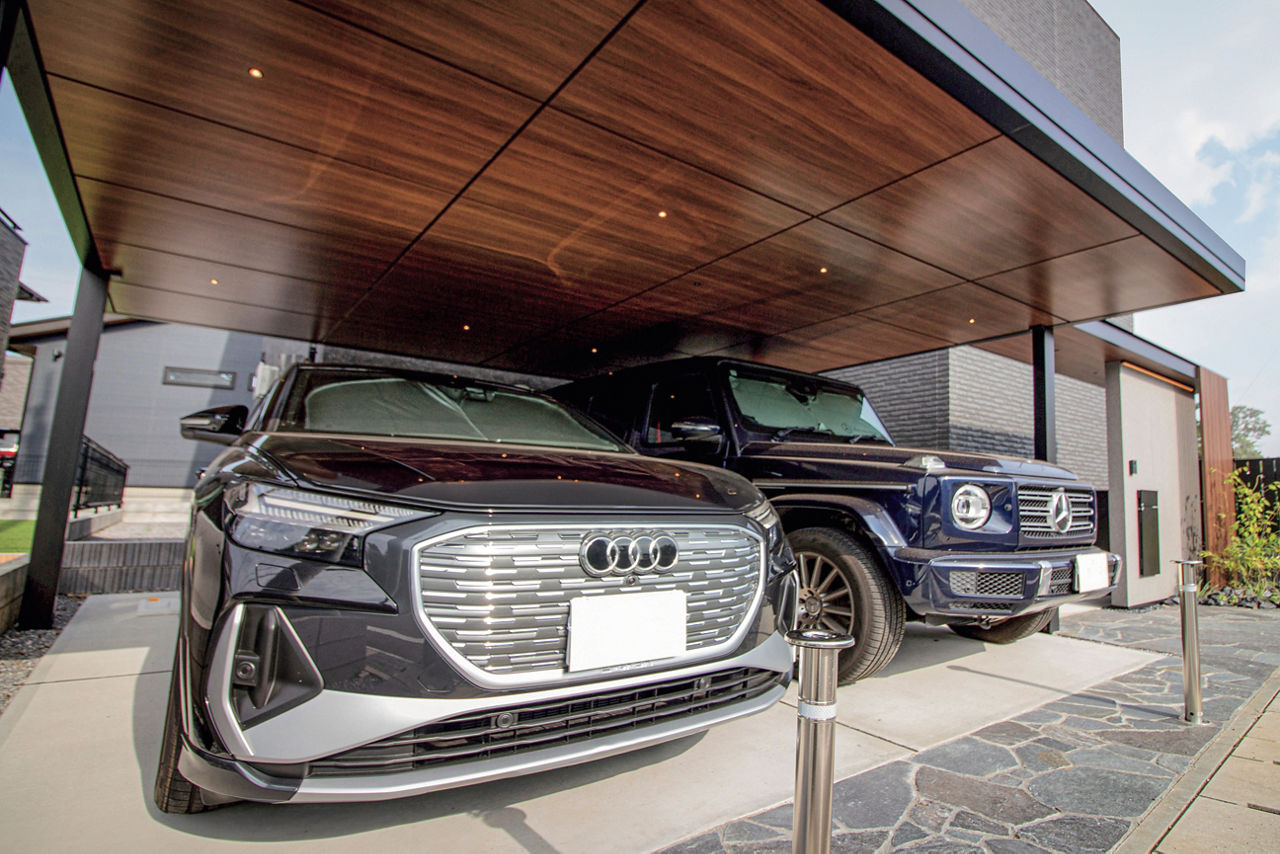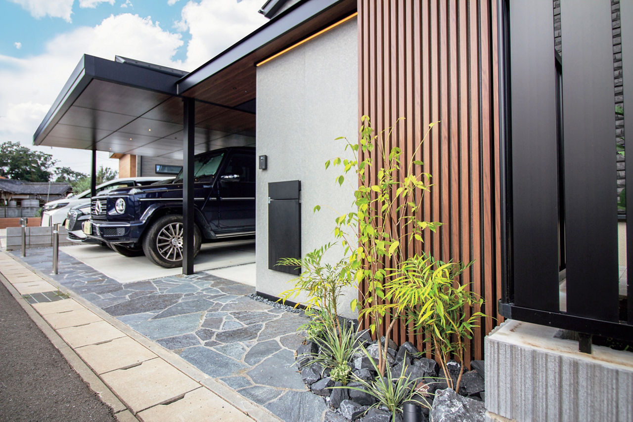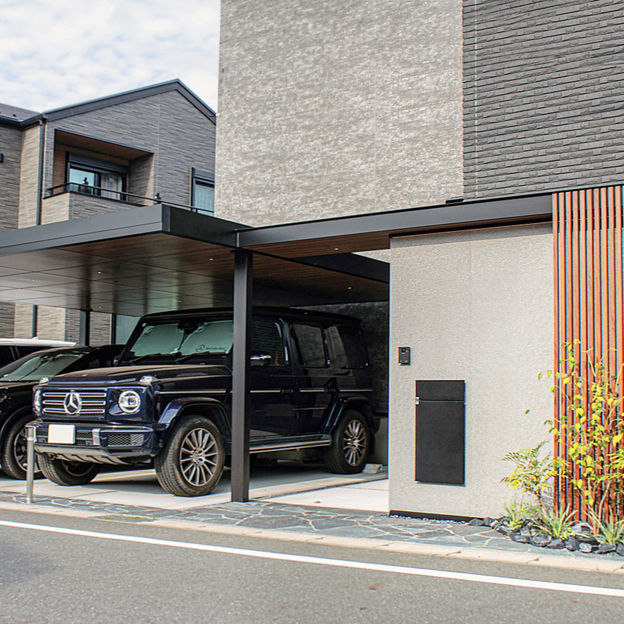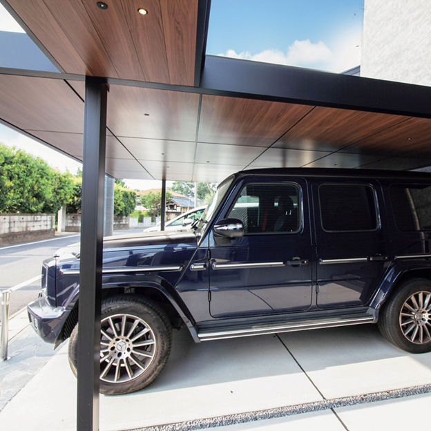 カースペースに設置したGルーフ カールーフタイプは、エントランスとつなげてデザインすることで、一体感のあるファサードに。天井材の木目調の意匠、縦格子のデザイン格子、Gウォールが洗練された空間を演出しています。